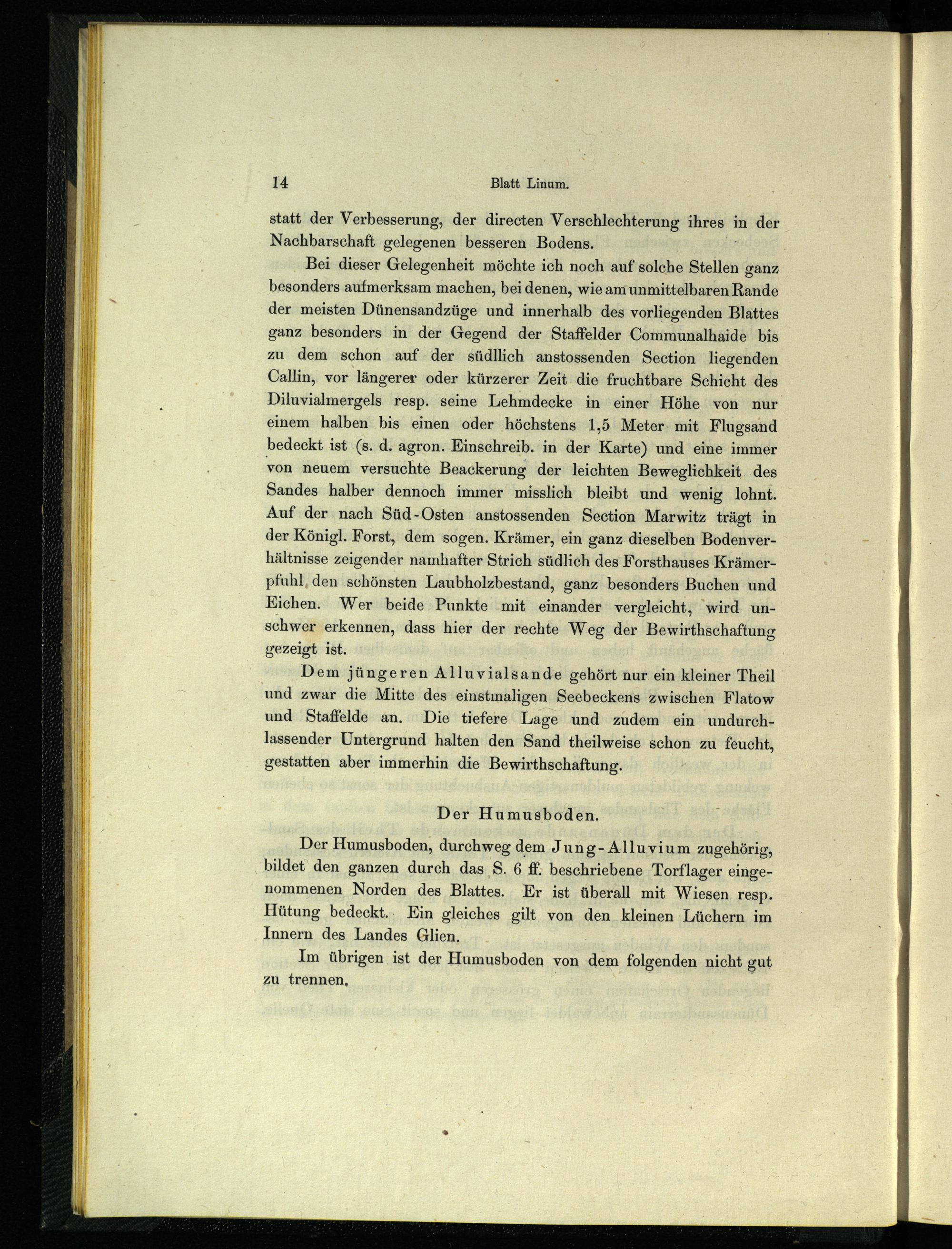 Der Humusboden, durchweg dem Jung- Alluvium zugehörig, bildet den ganzen durch das S. 6 ff: beschriebene Torflager eingenommenen Norden des Blattes. Er ist überall mit Wiesen resp. Hütung bedeckt... Ein gleiches gilt von den kleinen Lüchern im Innern des Landes Glien.