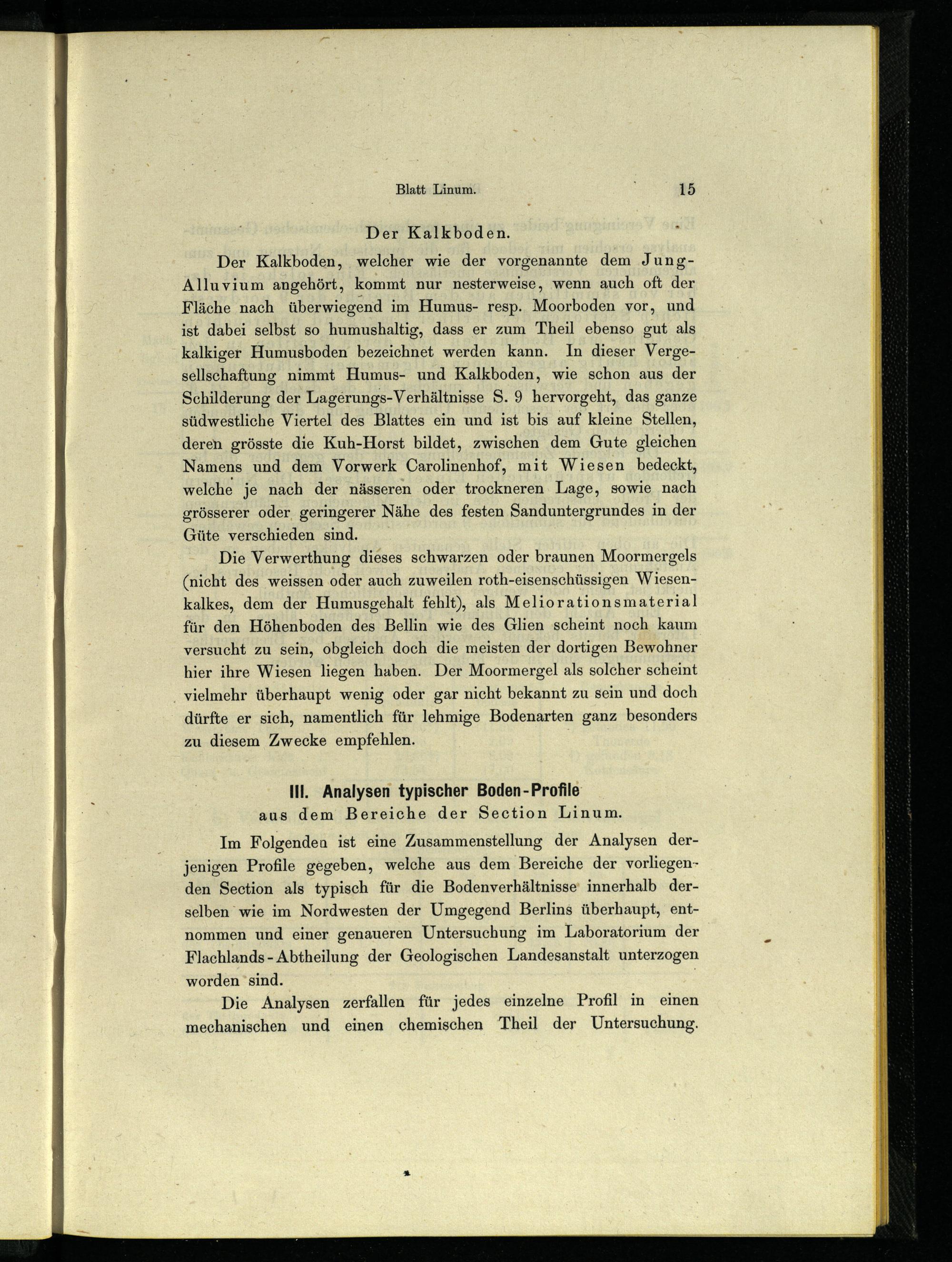 Im Folgenden ist eine Zusammenstellung der Analysen derjenigen Profile gegeben, welche aus dem Bereiche der vorliegenden Section als typisch für die Bodenverhältnisse' innerhalb derselben wie im Nordwesten der Umgegend Berlins überhaupt, entnommen und einer genaueren Untersuchung im Laboratorium der Flachlands- Abtheilung der Geologischen Landesanstalt unterzogen worden"sind..