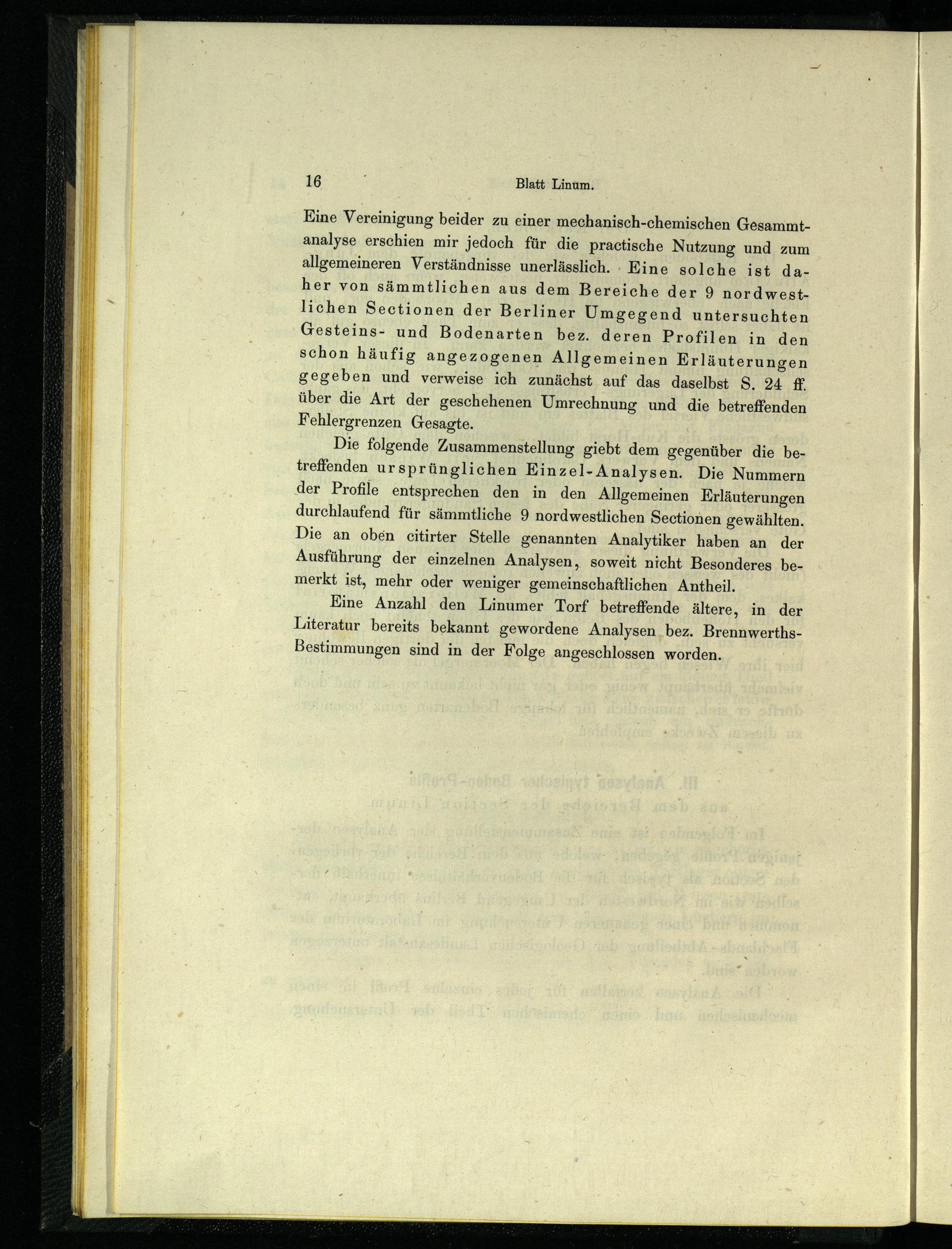 Eine Vereinigung beider zu einer mechanisch-chemischen Gesammtanalyse erschien mir jedoch für die practische Nutzung und zum allgemeineren Verständnisse unerlässlich.- Eine solche ist daher von sämmtlichen aus dem Bereiche der 9 nordwestlichen Sectionen der Berliner Umgegend untersuchten Gesteins- und Bodenarten bez. deren Profilen in den schon häufig angezogenen Allgemeinen Erläuterungen gegeben und verweise ich zunächst auf das daselbst S. 24 ff. über die Art der geschehenen Umrechnung und die betreffenden Fehlergrenzen Gesagte.