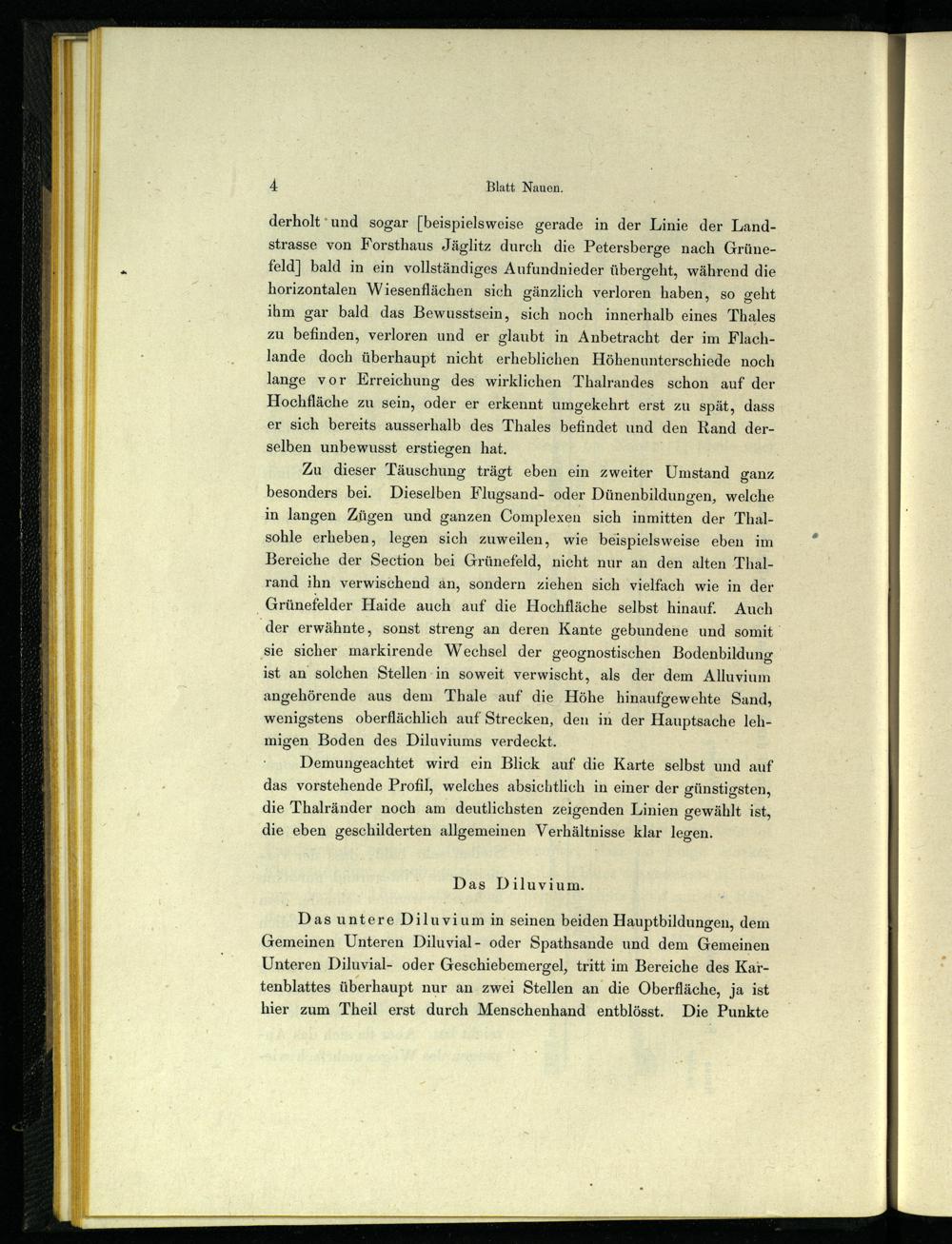Zu dieser Täuschung trägt eben ein zweiter Umstand ganz besonders bei. Dieselben Flugsand- oder Dünenbildungen, welche in langen Zügen und ganzen Complexen sich inmitten der Thalsohle erheben, legen sich zuweilen, wie beispielsweise eben im Bereiche der Section bei Grünefeld, nicht nur an den alten Thalrand ihn verwischend an, sondern ziehen sich vielfach wie in der _Grünefelder Haide auch auf die Hochfläche selbst hinauf. Auch ‚der erwähnte, sonst streng an deren Kante gebundene und somit sie sicher markirende Wechsel der geognostischen Bodenbildung ist an solchen Stellen-in soweit verwischt, als der dem Alluvium angehörende aus dem Thale auf die Höhe hinaufgewehte Sand, wenigstens oberflächlich auf Strecken, den in der Hauptsache lehmigen Boden des Diluviums verdeckt.
