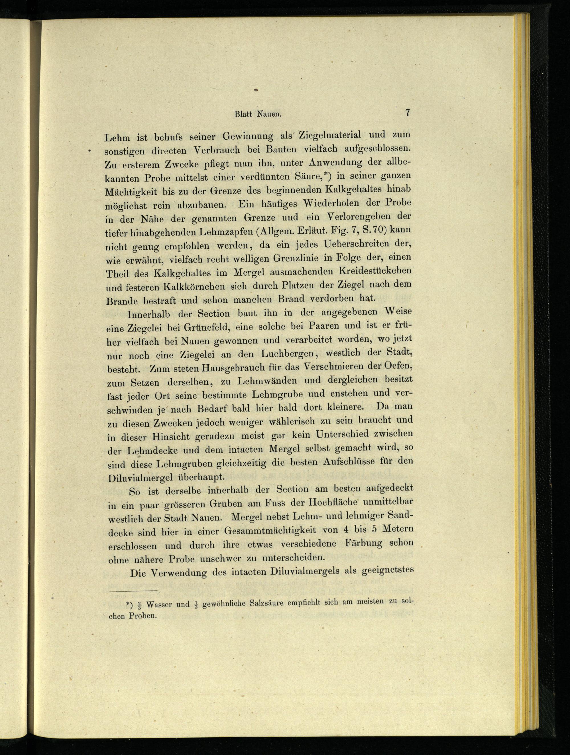 So ist derselbe inherhalb der Section am besten aufgedeckt in ein paar grösseren Gruben am Fuss der Hochfläche‘ unmittelbar westlich der Stadt Nauen. Mergel nebst Lehm- und lehmiger Sanddecke sind hier in einer Gesammtmächtigkeit von 4 bis 5 Metern erschlossen und durch ihre etwas verschiedene Färbung schon ohne nähere Probe unschwer zu unterscheiden.