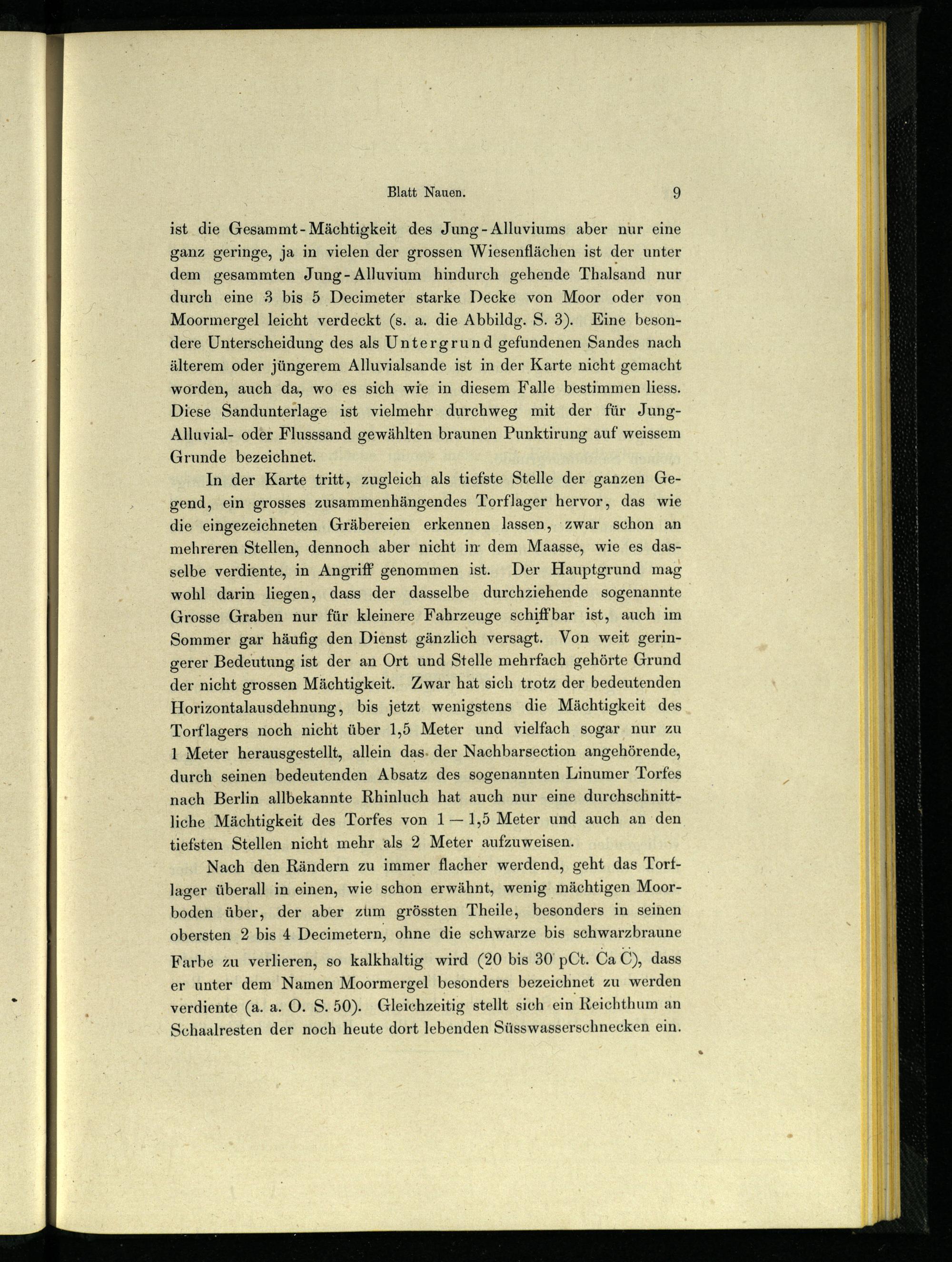 Nach den Rändern zu immer flacher werdend, geht das Torflager überall in einen, wie schon erwähnt, wenig mächtigen Moorboden über, der aber zum grössten Theile, besonders in seinen obersten 2 bis 4 Deecimetern, ohne die schwarze bis schwarzbraune Farbe zu verlieren, so kalkhaltig wird(20 bis 30 pCt. Ca©) dass er unter dem Namen Moormergel besonders bezeichnet zu werden verdiente(a. a. O. S. 50). Gleichzeitig stellt sich ein Reichthum an Schaalresten der noch heute dort lebenden Süsswasserschnecken ein.