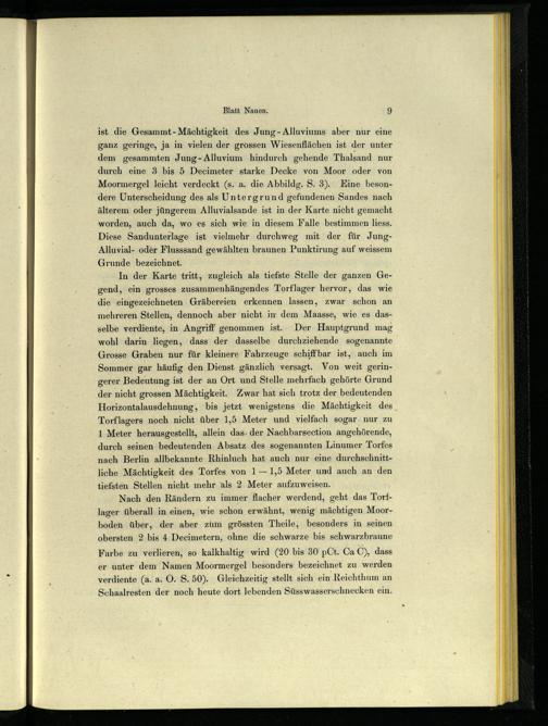 durch eine 3 bis 5 Decimeter starke Decke von Moor oder von Moormergel leicht verdeckt(s. a. die Abbildg. S. 3). Eine besondere Unterscheidung des als Untergrund gefundenen Sandes nach älterem oder jüngerem Alluvialsande ist in der Karte nicht gemacht worden, auch da, wo es sich wie in diesem Falle bestimmen liess. Diese Sandunterlage ist vielmehr. durchweg mit der für JungAlluvial- oder Flusssand gewählten braunen Punktirung auf weissem Grunde bezeichnet.