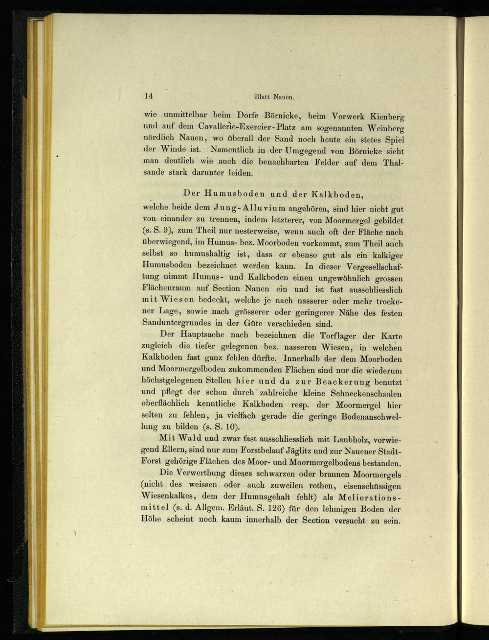 von einander zu trennen, indem letzterer, von Moormergel gebildet (s. S. 9), zum Theil nur nesterweise, wenn auch oft der Fläche nach überwiegend, im Humus- bez. Moorboden vorkommt, zum Theil auch selbst so humushaltig ist, dass er ebenso gut als ein kalkiger Humusboden bezeichnet werden kann. In dieser Vergesellschaftung nimmt Humus- und Kalkboden einen ungewöhnlich grossen Flächenraum auf Section Nauen ein und ist fast ausschliesslich mit Wiesen bedeckt, welche je nach nasserer oder mehr trockener Lage, sowie nach grösserer oder geringerer Nähe des festen Sanduntergrundes in der Güte verschieden sind.