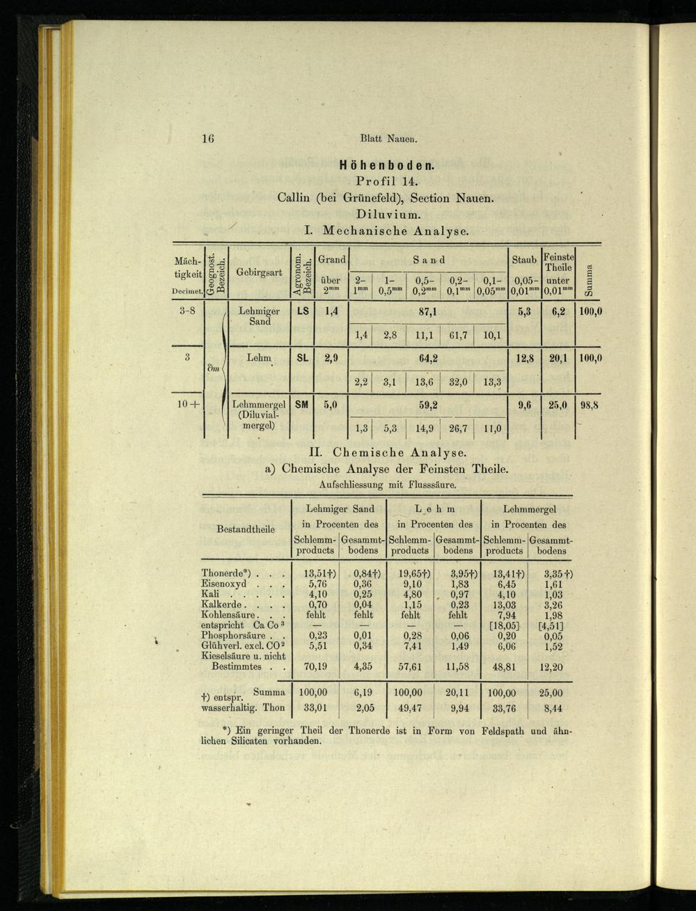 Höhenboden. Profil 14. Callin(bei Grünefeld), Section Nauen. Diluvium. I. Mechanische Analyse.