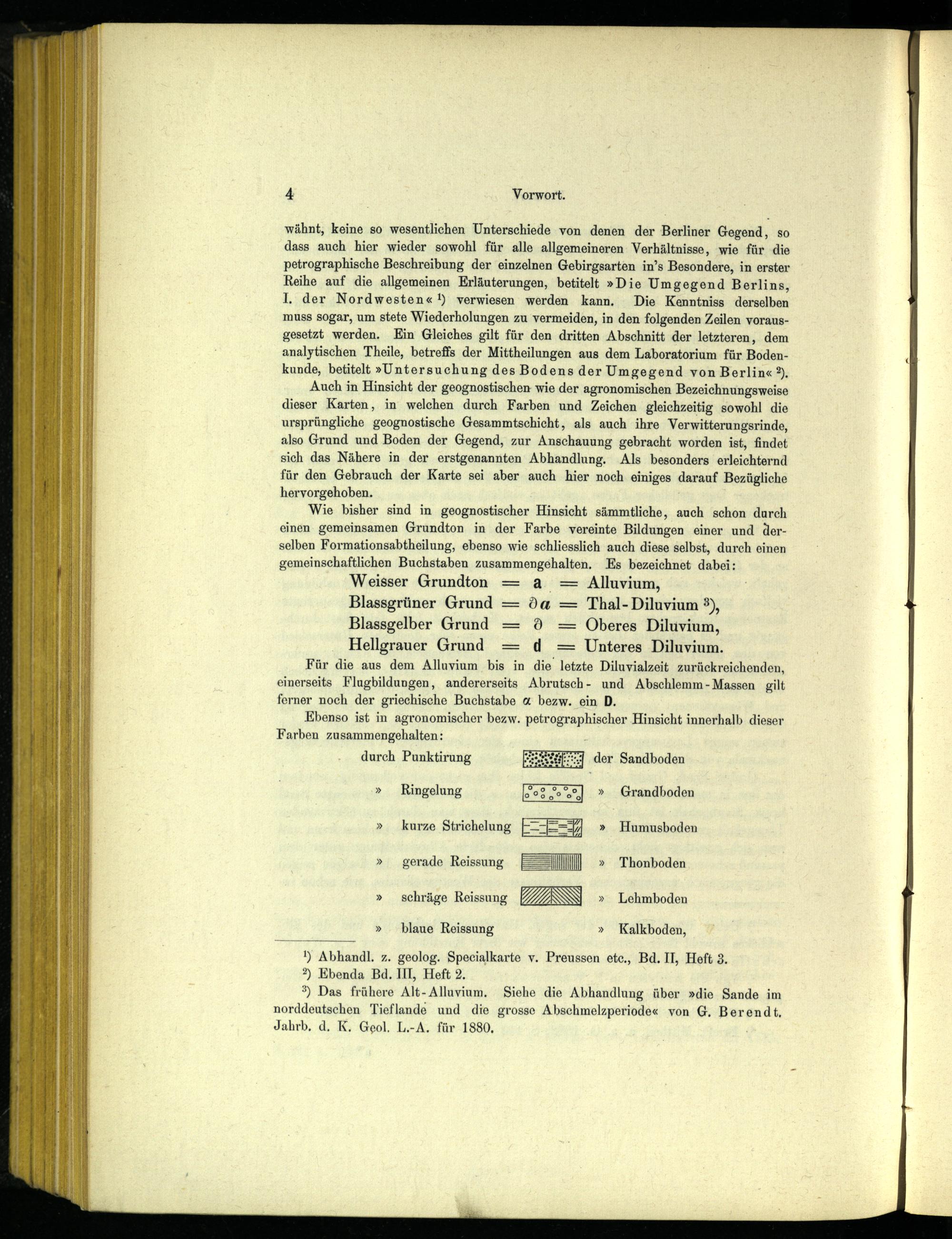 Auch in Hinsicht der geognostischen wie der agronomischen Bezeichnungsweise dieser Karten, in welchen durch Farben und Zeichen gleichzeitig sowohl die ursprüngliche geognostische Gesammtschicht, als auch ihre Verwitterungsrinde, also Grund und Boden der Gegend, zur Anschauung gebracht worden ist, findet sich das Nähere in der erstgenannten Abhandlung. Als besonders erleichternd für den Gebrauch der Karte sei aber auch hier noch einiges darauf Bezügliche hervorgehoben.