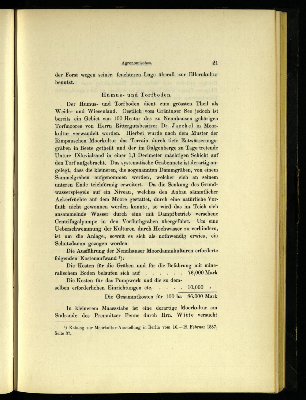 Der Humus- und Torfboden dient zum grössten Theil als Weide- und Wiesenland. Oestlich vom Gräninger See jedoch ist bereits ein Gebiet von 100 Hectar des zu Nennhausen gehörigen Torfmoores von Herrn Rittergutsbesitzer Dr. Jaeckel in Moorkultur verwandelt worden. Hierbei wurde nach dem Muster der Rimpauschen Moorkultur das Terrain durch tiefe Entwässerungsgräben in Beete getheilt und der im Galgenberge zu Tage tretende Untere Diluvialsand in einer 1,1 Decimeter mächtigen Schicht auf den Torf aufgebracht. Das systematische Grabennetz ist derartig angelegt, dass die kleineren, die sogenannten Dammgräben, von einem Sammelgraben aufgenommen werden, welcher sich an seinem unteren Ende teichförmig erweitert. Da die Senkung des Grundwasserspiegels auf ein Niveau, welches den Anbau sämmtlicher Ackerfrüchte auf dem Moore gestattet, durch eine natürliche Vorfluth nicht gewonnen werden konnte, so wird das im Teich sich ansammelnde Wasser durch eine mit Dampfbetrieb versehene Centrifugalpumpe in den Vorfluthgraben übergeführt. Um eine Ueberschwemmung der Kulturen durch Hochwasser zu verhindern, ist um die Anlage, soweit es sich als nothwendig erwies, ein Schutzdamm gezogen worden.