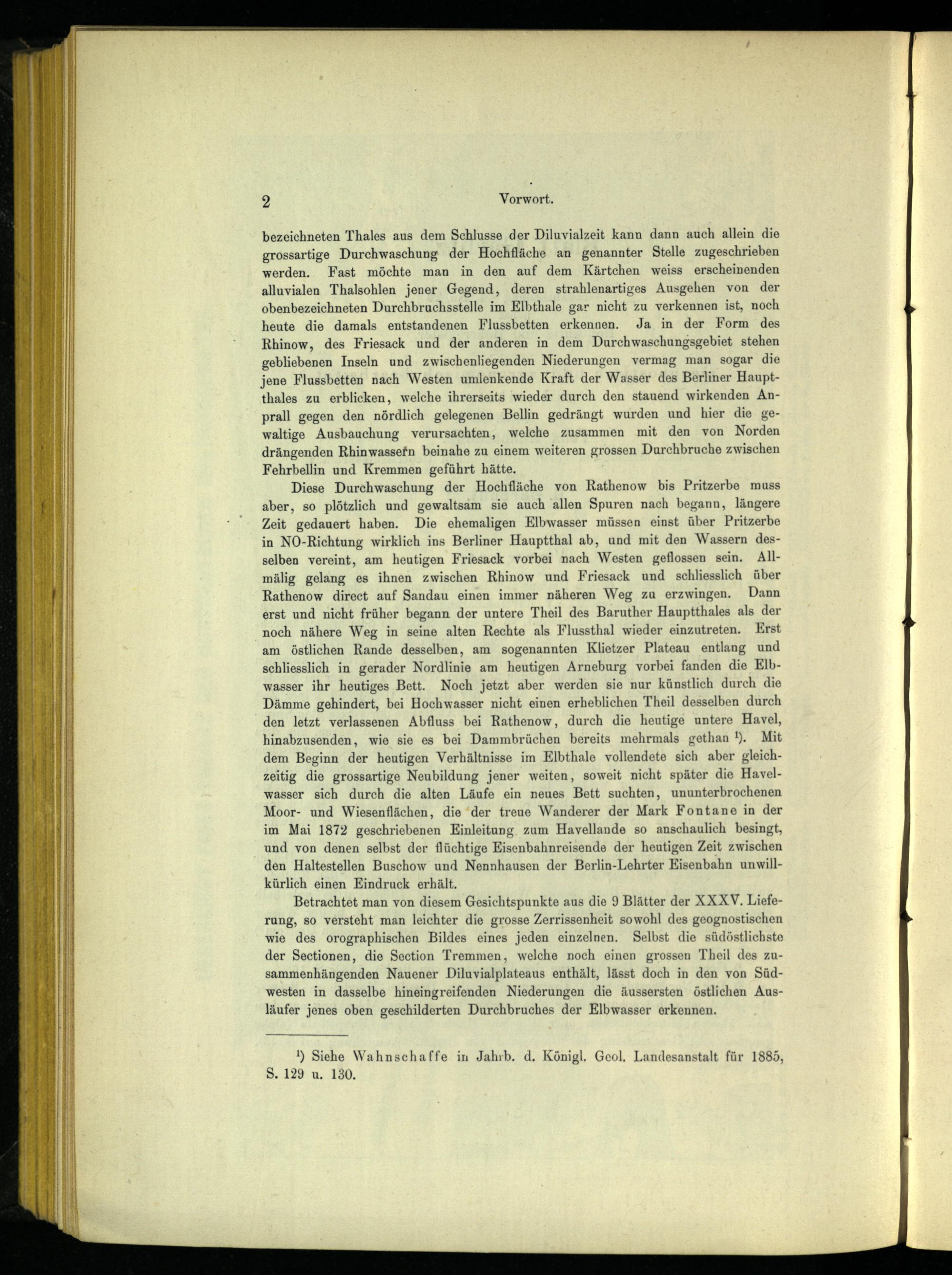 Diese Durchwaschung der Hochfläche von Rathenow bis Pritzerbe muss aber, so plötzlich und gewaltsam sie auch allen Spuren nach begann, längere Zeit gedauert haben. Die ehemaligen Elbwasser müssen einst über Pritzerbe in NO-Richtung wirklich ins Berliner Hauptthal ab, und mit den Wassern desselben vereint, am heutigen Friesack vorbei nach Westen geflossen sein. Allmälig gelang es ihnen zwischen Rhinow und Friesack und schliesslich über Rathenow direct auf Sandau einen immer näheren Weg zu erzwingen. Dann erst und nicht früher begann der untere Theil des Baruther Hauptthales als der noch nähere Weg in seine alten Rechte als Flussthal wieder einzutreten. Erst am östlichen Rande desselben, am sogenannten Klietzer Plateau entlang und schliesslich in gerader Nordlinie am heutigen Arneburg vorbei fanden die Elbwasser ihr heutiges Bett. Noch jetzt aber werden sie nur künstlich durch die Dämme gehindert, bei Hochwasser nicht einen erheblichen Theil desselben durch den letzt verlassenen Abfluss bei Rathenow , durch die heutige untere Havel , hinabzusenden, wie sie es bei Dammbrüchen bereits mehrmals gethan!). Mit dem Beginn der heutigen Verhältnisse im Elbthale vollendete sich aber gleichzeitig die grossartige Neubildung jener weiten, soweit nicht später die Havelwasser sich durch die alten Läufe ein neues Bett suchten, ununterbrochenen Moor- und Wiesenflächen, die‘der treue Wanderer der Mark Fontane in der im Mai 1872 geschriebenen Einleitung zum Havellande so anschaulich besingt, und von denen selbst der flüchtige Eisenbahnreisende der heutigen Zeit zwischen den Haltestellen Buschow und Nennhausen der Berlin-Lehrter Eisenbahn unwillkürlich einen Eindruck erhält.