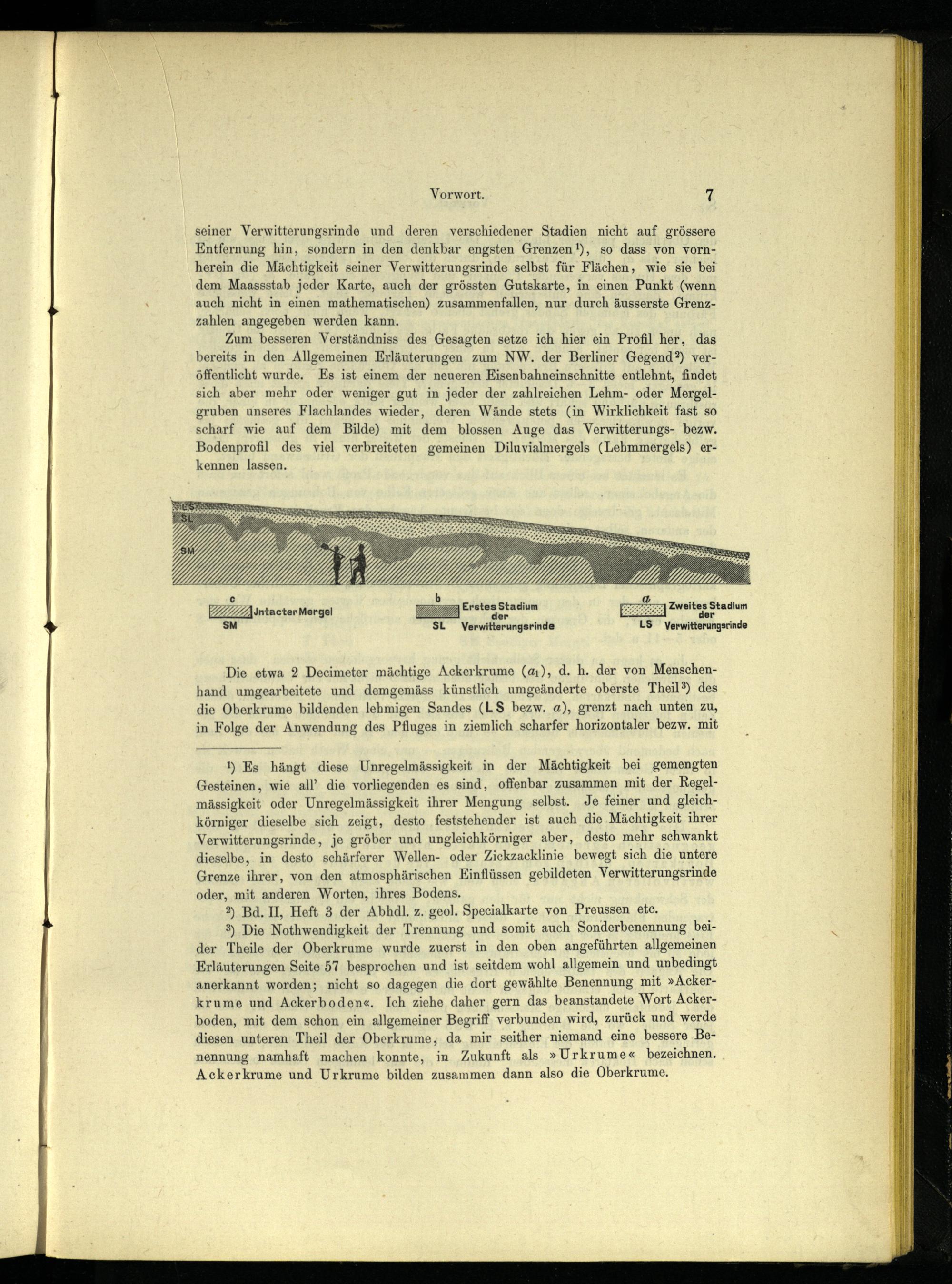 3) Die Nothwendigkeit der Trennung und somit auch Sonderbenennung beider Theile der Oberkrume wurde zuerst in den oben angeführten allgemeinen Erläuterungen Seite 57 besprochen und ist seitdem wohl allgemein und unbedingt anerkannt worden; nicht so dagegen die dort gewählte Benennung mit»Ackerkrume und Ackerboden«. Ich ziehe daher gern das beanstandete Wort Ackerboden, mit dem schon ein allgemeiner Begriff verbunden wird, zurück und werde diesen unteren Theil der Oberkrume, da mir seither niemand eine bessere Benennung namhaft machen konnte, in Zukunft als»Urkrume« bezeichnen, Ackerkrume und Urkrume bilden zusammen dann also die Oberkrume,