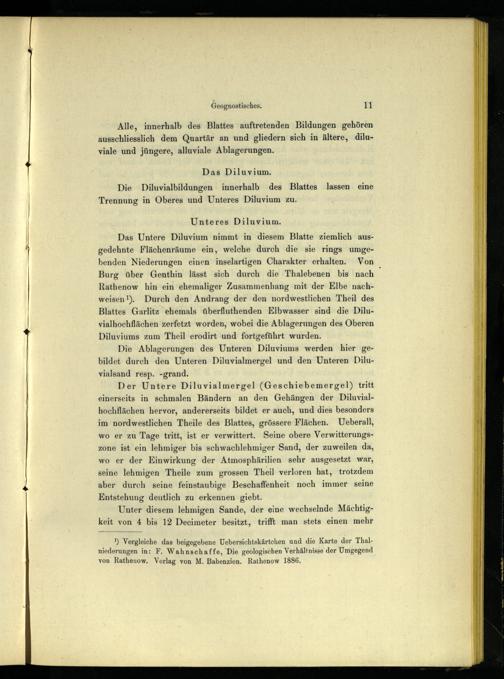 Das Untere Diluvium nimmt in diesem Blatte ziemlich ausgedehnte Flächenräume ein, welche durch die sie rings umgebenden Niederungen einen inselartigen Charakter erhalten. Von Burg über Genthin lässt sich durch die Thalebenen bis nach 7 Rathenow hin ein ehemaliger Zusammenhang mit der Elbe nachweisen!). Durch den Andrang der den nordwestlichen Theil des Blattes Garlitz ehemals überfluthenden Elbwasser sind die Diluvialhochflächen zerfetzt worden, wobei die Ablagerungen des Oberen Diluviums zum Theil erodirt und fortgeführt wurden.