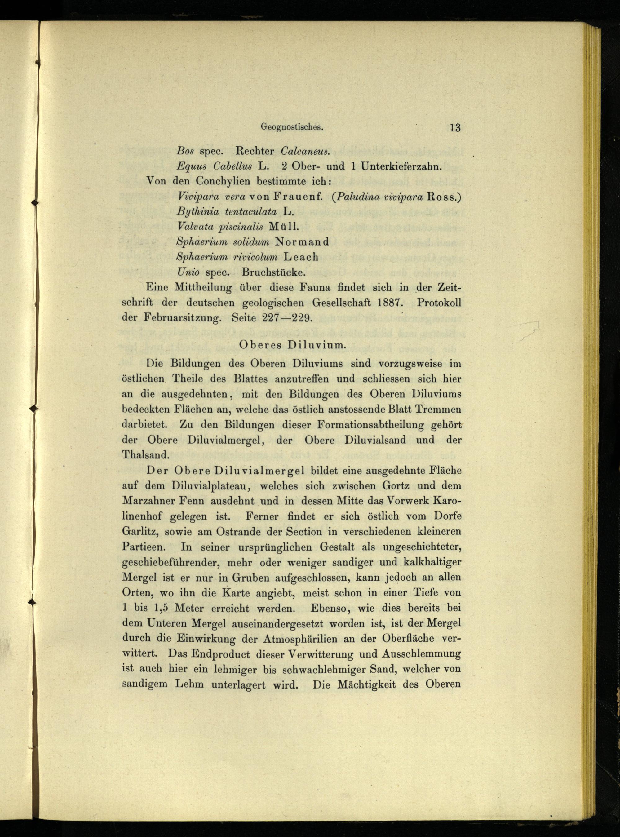 Der Obere Diluvialmergel bildet eine ausgedehnte Fläche auf dem Diluvialplateau, welches sich zwischen Gortz und dem Marzahner Fenn ausdehnt und in dessen Mitte das Vorwerk Karolinenhof gelegen ist. Ferner findet er sich östlich vom Dorfe Garlitz, sowie am Ostrande der Section in verschiedenen kleineren Partieen. In seiner ursprünglichen Gestalt als ungeschichteter, geschiebeführender, mehr oder weniger sandiger und kalkhaltiger Mergel ist er nur in Gruben aufgeschlossen, kann jedoch an allen Orten, wo ihn die Karte angiebt, meist schon in einer Tiefe von 1 bis 1,5 Meter erreicht werden. Ebenso, wie dies bereits bei dem Unteren Mergel auseinandergesetzt worden ist, ist der Mergel durch die Einwirkung der Atmosphärilien an der Oberfläche verwittert. Das Endproduct dieser Verwitterung und Ausschlemmung ist auch hier ein lehmiger bis schwachlehmiger Sand, welcher von sandigem Lehm unterlagert wird. Die Mächtigkeit des Oberen