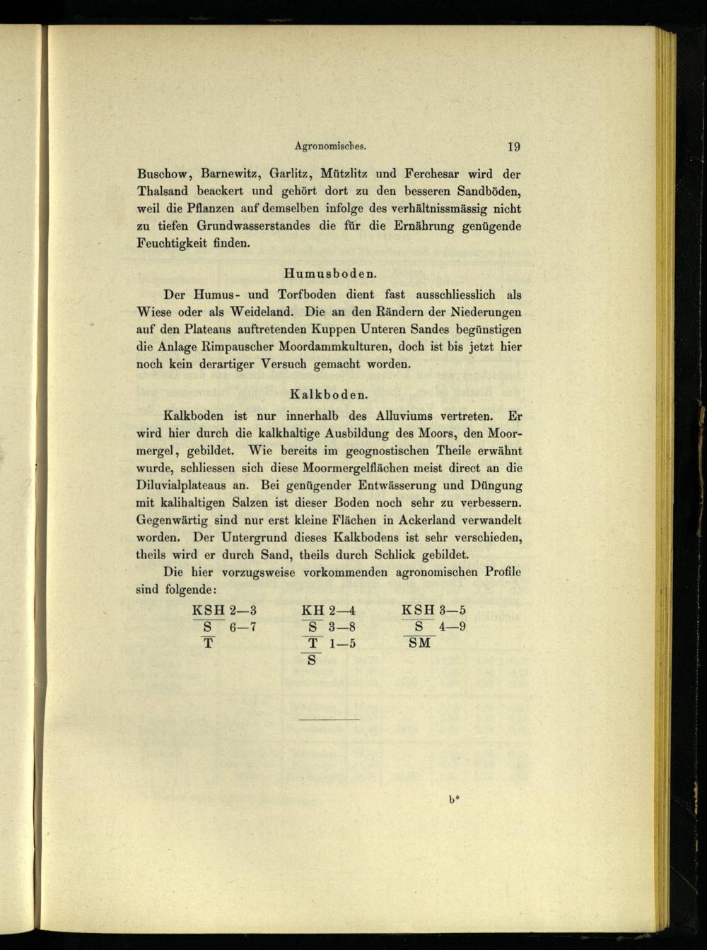 Kalkboden ist nur innerhalb des Alluviums vertreten. Er wird hier durch die kalkhaltige Ausbildung des Moors, den Moormergel, gebildet. Wie bereits im geognostischen Theile erwähnt wurde, schliessen sich diese Moormergelflächen meist direct an die Diluvialplateaus an. Bei genügender Entwässerung und Düngung mit kalihaltigen Salzen ist dieser Boden noch sehr zu verbessern. Gegenwärtig sind nur erst kleine Flächen in Ackerland verwandelt worden. Der Untergrund dieses Kalkbodens ist sehr verschieden, theils wird er durch Sand, theils durch Schlick gebildet.