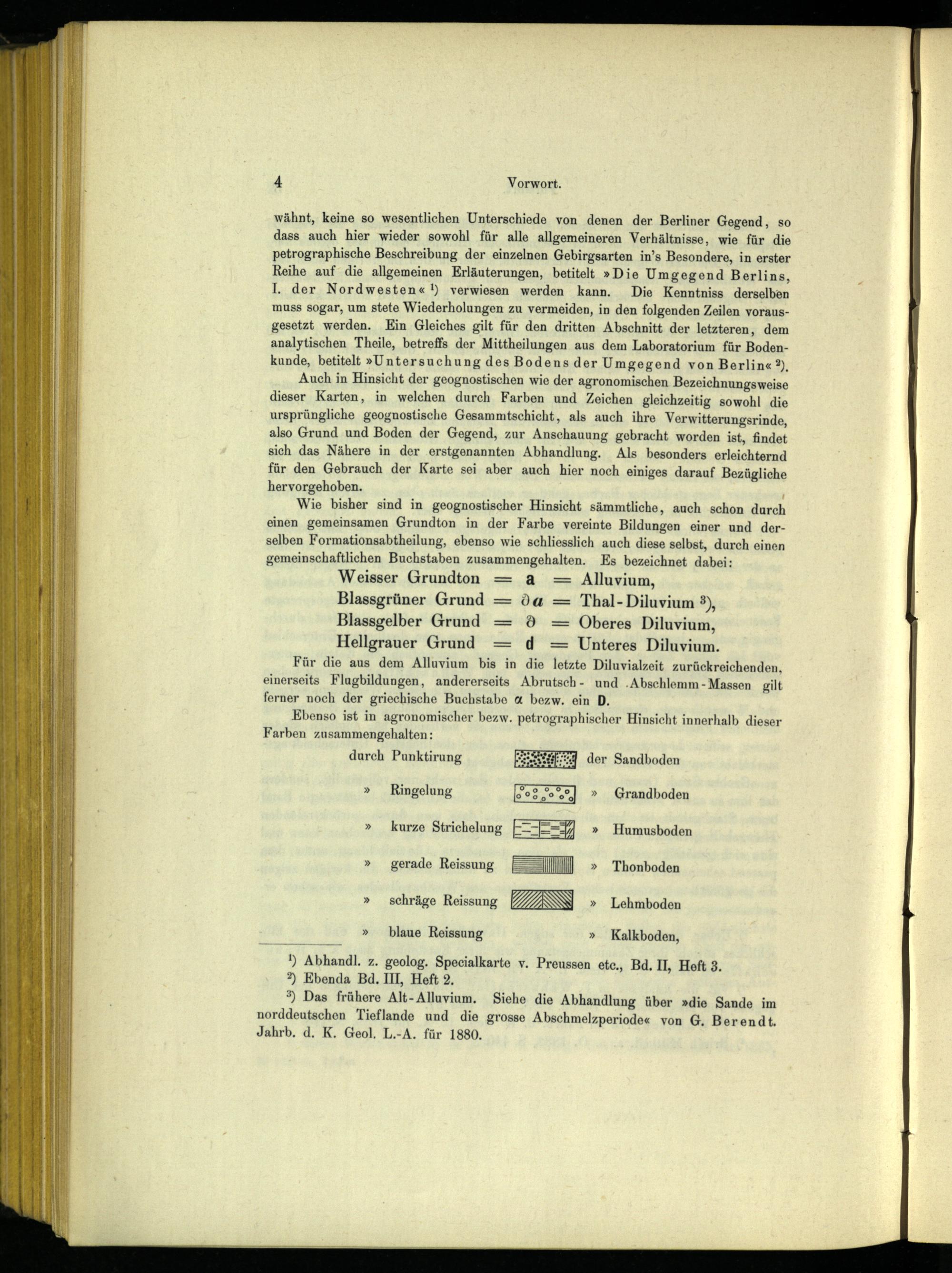 wähnt, keine so wesentlichen Unterschiede von denen der Berliner Gegend, so dass auch hier wieder sowohl für alle allgemeineren Verhältnisse, wie für die petrographische Beschreibung der einzelnen Gebirgsarten in’s Besondere, in erster Reihe auf die allgemeinen Erläuterungen, betitelt»Die Umgegend Berlins , I. der Nordwesten«!) verwiesen werden kann. Die Kenntniss derselben muss sogar, um stete Wiederholungen zu vermeiden, in den folgenden Zeilen vorausgesetzt werden. Ein Gleiches gilt für den dritten Abschnitt der letzteren, dem analytischen Theile, betreffs der Mittheilungen aus dem Laboratorium für Bodenkunde, betitelt»Untersuchung des Bodens der Umgegend von Berlin « 3). Auch in Hinsicht der geognostischen wie der agronomischen Bezeichnungsweise dieser Karten, in welchen durch Farben und Zeichen gleichzeitig sowohl die ursprüngliche geognostische Gesammtschicht, als auch ihre Verwitterungsrinde, also Grund und Boden der Gegend, zur Anschauung gebracht worden ist, findet sich das Nähere in der erstgenannten Abhandlung. Als besonders erleichternd für den Gebrauch der Karte sei aber auch hier noch einiges darauf Bezügliche hervorgehoben.\ Wie bisher sind in geognostischer Hinsicht sämmtliche, auch schon durch einen gemeinsamen Grundton in der Farbe vereinte Bildungen einer und derselben Formationsabtheilung, ebenso wie schliesslich auch diese selbst, durch einen gemeinschaftlichen Buchstaben zusammengehalten. Es bezeichnet dabei: