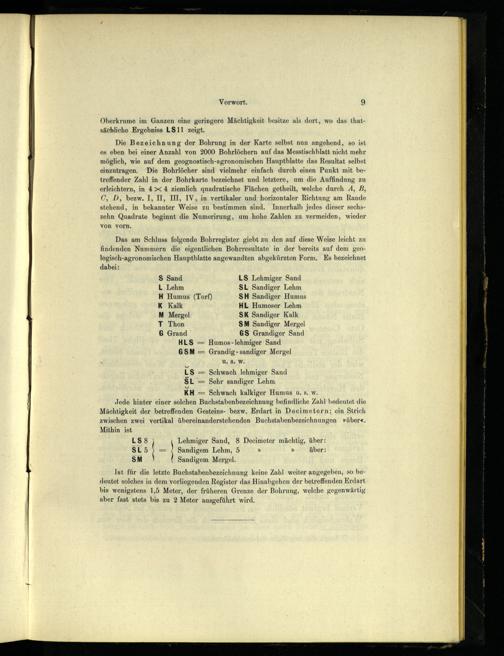 Ist für die letzte Buchstabenbezeichnung keine Zahl weiter angegeben, so bedeutet solches in dem vorliegenden Register das Hinabgehen der betreffenden Erdart bis wenigstens 1,5 Meter, der früheren Grenze der Bohrung, welche gegenwärtig aber fast stets bis zu 2 Meter ausgeführt wird.