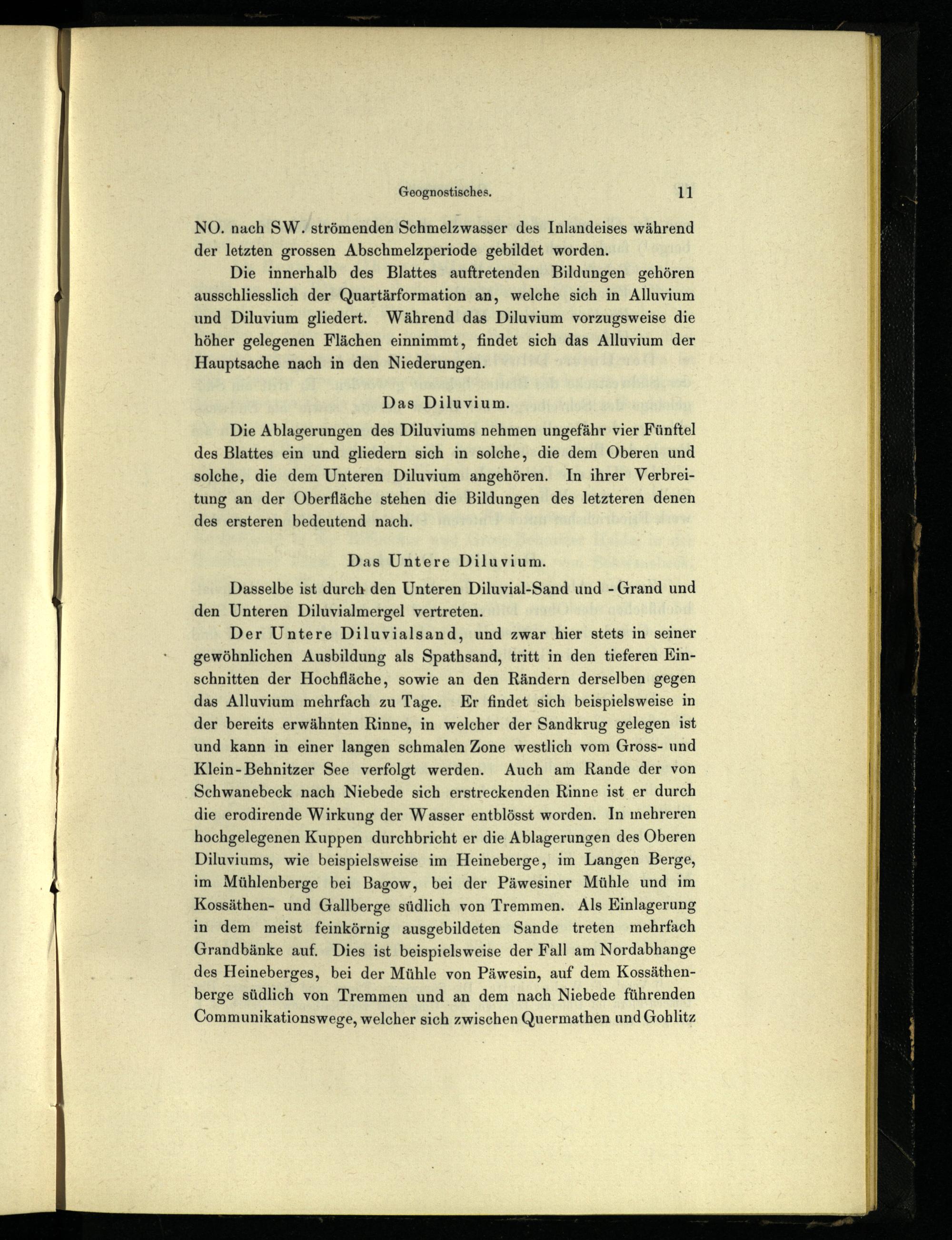 Der Untere Diluvialsand, und zwar hier stets in seiner gewöhnlichen Ausbildung als Spathsand, tritt in den tieferen Einschnitten der Hochfläche, sowie an den Rändern derselben gegen das Alluvium mehrfach zu Tage. Er findet sich beispielsweise in der bereits erwähnten Rinne, in welcher der Sandkrug gelegen ist und kann in einer langen schmalen Zone westlich vom Gross- und Klein-Behnitzer See verfolgt werden. Auch am Rande der von Schwanebeck nach Niebede sich erstreckenden Rinne ist er durch die erodirende Wirkung der Wasser entblösst worden. In mehreren hochgelegenen Kuppen durchbricht er die Ablagerungen des Oberen Diluviums, wie beispielsweise im Heineberge, im Langen Berge, im Mühlenberge bei Bagow, bei der Päwesiner Mühle und im Kossäthen- und Gallberge südlich von Tremmen . Als Einlagerung in dem meist feinkörnig ausgebildeten Sande treten mehrfach Grandbänke auf. Dies ist beispielsweise der Fall am Nordabhange des Heineberges, bei der Mühle von Päwesin , auf dem Kossäthenberge südlich von Tremmen und an dem nach Niebede führenden Communikationswege, welcher sich zwischen Quermathen und Gohlitz
