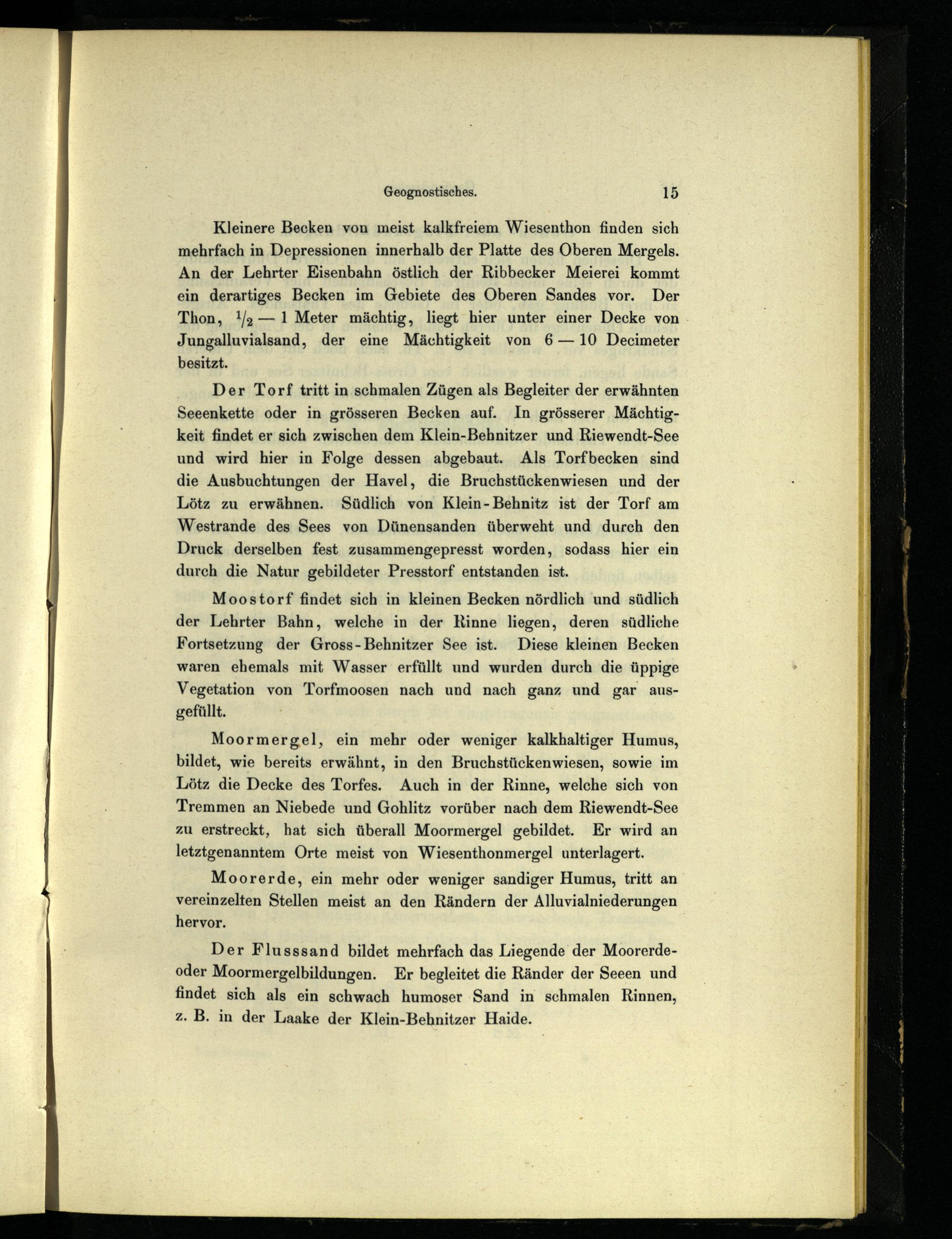 Kleinere Becken von meist kalkfreiem Wiesenthon finden sich mehrfach in Depressionen innerhalb der Platte des Oberen Mergels. An der Lehrter Eisenbahn östlich der Ribbecker Meierei kommt ein derartiges Becken im Gebiete des Oberen Sandes vor. Der Thon,!/2— 1 Meter mächtig, liegt hier unter einer Decke von Jungalluvialsand, der eine Mächtigkeit von 6— 10 Decimeter besitzt.