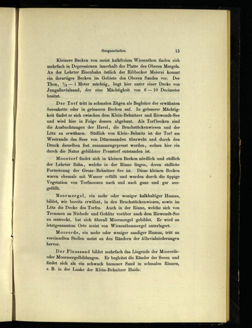Moormergel, ein mehr oder weniger kalkhaltiger Humus, bildet, wie bereits erwähnt, in den Bruchstückenwiesen, sowie im Lötz die Decke des Torfes. Auch in der Rinne, welche sich von Tremmen an Niebede und Gohlitz vorüber nach dem Riewendt-See zu erstreckt, hat sich überall Moormergel gebildet. Er wird an letztgenanntem Orte meist von Wiesenthonmergel unterlagert.