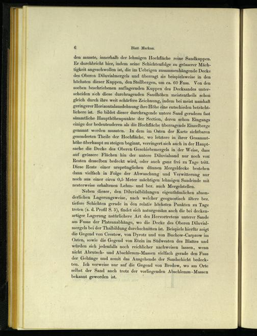 den musste, innerhalb der lehmigen Hochfläche reine Sandkuppen. Er durchbricht hier, indem seine Schichtenfolge zu grösserer Mächtigkeit angeschwollen ist, die im Uebrigen zusammenhängende Decke des Oberen Diluvialmergels und überragt sie beispielsweise in den höchsten dieser Kuppen, den Stellbergen, um ca. 60 Fuss. Von den soeben beschriebenen auflagernden Kuppen des Decksandes unterscheiden sich diese durchragenden Sandhöhen meistentheils schon gleich durch ihre weit schärfere Zeichnung, indem bei meist namhaft geringerer Horizontalausdehnung ihre Höhe eine entschieden beträchtlichere ist. So bildet dieser durchragende untere Sand geradezu fast sämmtliche Haupthöhenpunkte der Section, deren schon Eingangs einige der bedeutenderen als die Hochfläche überragende Kinzelberge genannt werden mussten. In dem im Osten der Karte sichtbaren gesonderten Theile der Hochfläche, wo letztere in ihrer Gesammthöhe überhaupt zu steigen beginnt, verringert sich auch in der Hauptsache die Decke des Oberen Geschiebemergels in der Weise, dass auf grössere Flächen hin der untere Diluvialsand nur noch von Resten desselben bedeckt wird, oder auch ganz frei zu Tage tritt. Diese Reste einer ursprünglichen dünnen Mergeldecke bestehen dann vielfach in Folge der Abwaschung und Verwitterung nur noch aus einer circa 0,5 Meter mächtigen lehmigen Sandrinde mit nesterweise erhaltenen Lehm- und bez. auch Mergelstellen. Neben dieser, den Diluvialbildungen eigenthümlichen absonderlichen Lagerungsweise, nach welcher geognostisch ältere bez. tiefere Schichten gerade in den relativ höchsten Punkten zu Tage treten(s. d. Profil S. 5), findet sich naturgemäss auch die bei deckenartiger Lagerung natürlichere Art des Hervortretens‘ unterer Sande am Fusse der Plateauabhänge, wo die Decke des Oberen Diluvialmergels bei der Thalbildung durchschnitten ist. Beispiele hierfür zeigt die Gegend von Ceestow, von Dyrotz und von Buchow-Carpzow im Osten, sowie die Gegend von Etzin im Südwesten des Blattes und würden sich jedenfalls noch reichlicher nachweisen lassen, wenn nicht Abrutsch- und Abschlemm-Massen vielfach gerade den Fuss der Gehänge und somit das Ausgehende der Sandschicht bedeckten. Ich verweise nur auf die Gegend von Bredow, wo am Orte