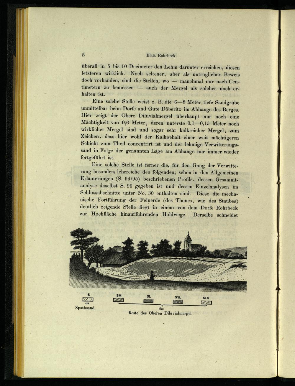 ‚Eine solche Stelle weist z. B. die 6—8 Meter. tiefe Sandgrube unmittelbar beim Dorfe und Gute Döberitz im Abhange des Berges. Hier zeigt der Obere Diluvialmergel überhaupt nur noch eine Mächtigkeit von 0,6 Meter, deren unterste 0,1—0,15 Meter noch wirklicher ‚Mergel sind und sogar sehr kalkreicher Mergel, zum Zeichen, dass hier wohl der Kalkgehalt einer weit mächtigeren Schicht zum Theil concentrirt ist und der lehmige Verwitterungs