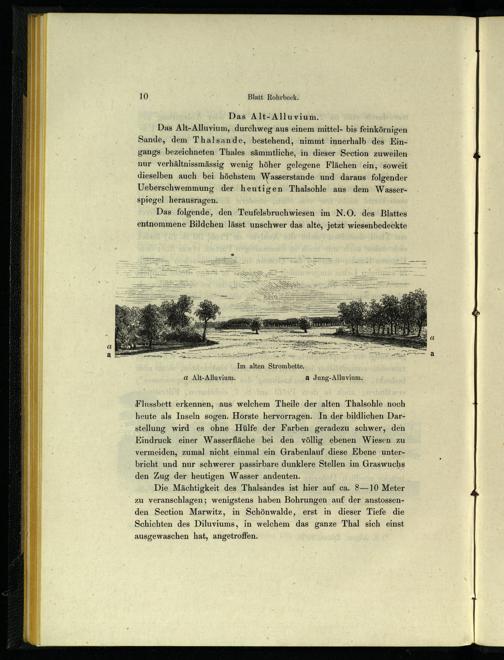 Das Alt-Alluvium, durchweg aus einem mittel- bis feinkörnigen Sande, dem Thalsande, bestehend, nimmt innerhalb des Eingangs bezeichneten Thales sämmtliche, in dieser Section zuweilen nur verhältnissmässig wenig höher gelegene Flächen ein, soweit dieselben auch bei höchstem Wasserstande und daraus folgender Ueberschwemmung der heutigen Thalsohle aus dem Wasser