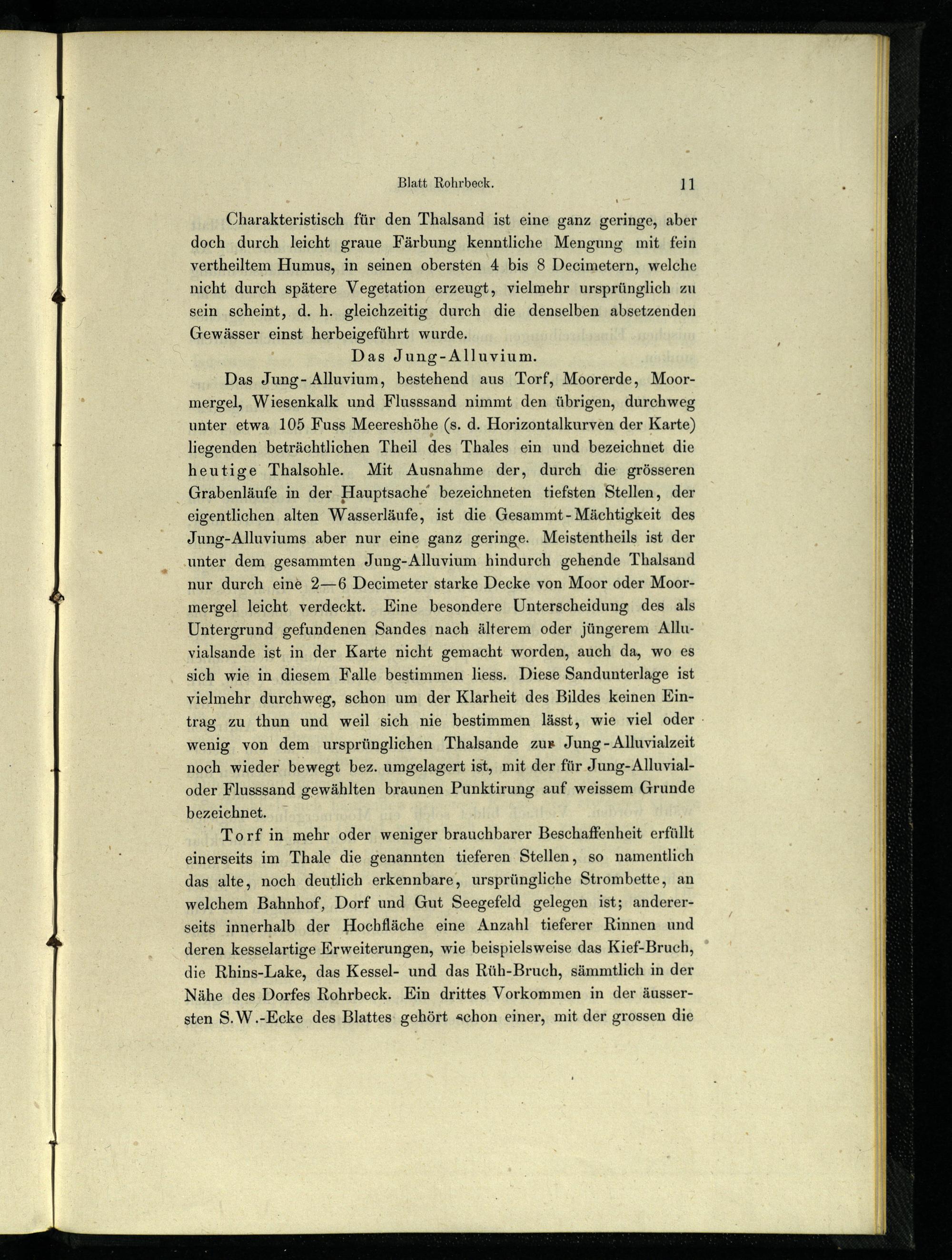Das Jung- Alluvium, bestehend aus Torf, Moorerde, Moormergel, Wiesenkalk und Flusssand nimmt den übrigen, durchweg unter etwa 105 Fuss Meereshöhe(s. d. Horizontalkurven der Karte) liegenden beträchtlichen Theil des Thales ein und bezeichnet die heutige Thalsohle. Mit Ausnahme der, durch die grösseren _ Grabenläufe in der Hauptsache bezeichneten tiefsten Stellen, der eigentlichen alten Wasserläufe, ist die Gesammt- Mächtigkeit des Jung-Alluviums ‚aber nur eine ganz geringe. Meistentheils ist der unter dem gesammten Jung-Alluvium hindurch gehende Thalsand nur durch eine 2—6 Decimeter starke Decke von Moor oder Moormergel leicht verdeckt. Eine besondere Unterscheidung des als Untergrund gefundenen Sandes nach älterem oder jüngerem Alluvialsande ist in der Karte nicht gemacht worden, auch da, wo es sich wie in diesem Falle bestimmen liess. Diese Sandunterlage ist vielmehr durchweg, schon um der Klarheit des Bildes keinen Eintrag zu thun und weil sich nie bestimmen lässt, wie viel oder wenig von dem ursprünglichen Thalsande zur Jung- Alluvialzeit noch wieder bewegt bez. umgelagert ist, mit der für Jung-Alluvialoder Flusssand gewählten braunen Punktirung auf weissem Grunde bezeichnet.