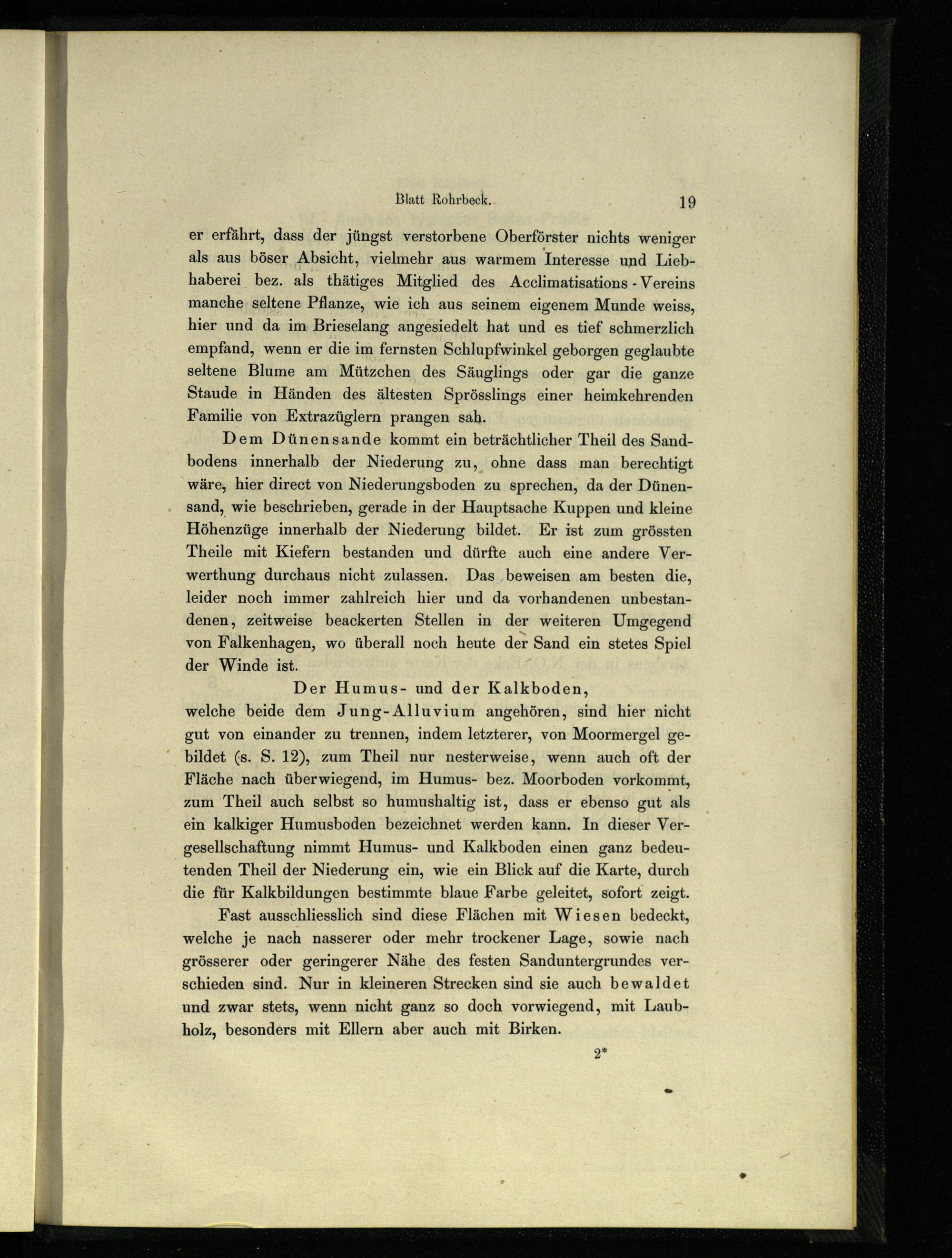 er erfährt, dass der jüngst verstorbene Oberförster nichts weniger als aus böser Absicht, vielmehr aus warmem Interesse und Liebhaberei bez. als thätiges Mitglied des Acclimatisations- Vereins manche, seltene Pflanze, wie ich aus seinem eigenem Munde weiss, hier und da im Brieselang angesiedelt hat und es tief schmerzlich empfand, wenn er die im fernsten Schlupfwinkel geborgen geglaubte seltene Blume am Mützchen des Säuglings oder gar die ganze Staude in Händen des ältesten Sprösslings einer heimkehrenden Familie von Extrazüglern prangen sah.