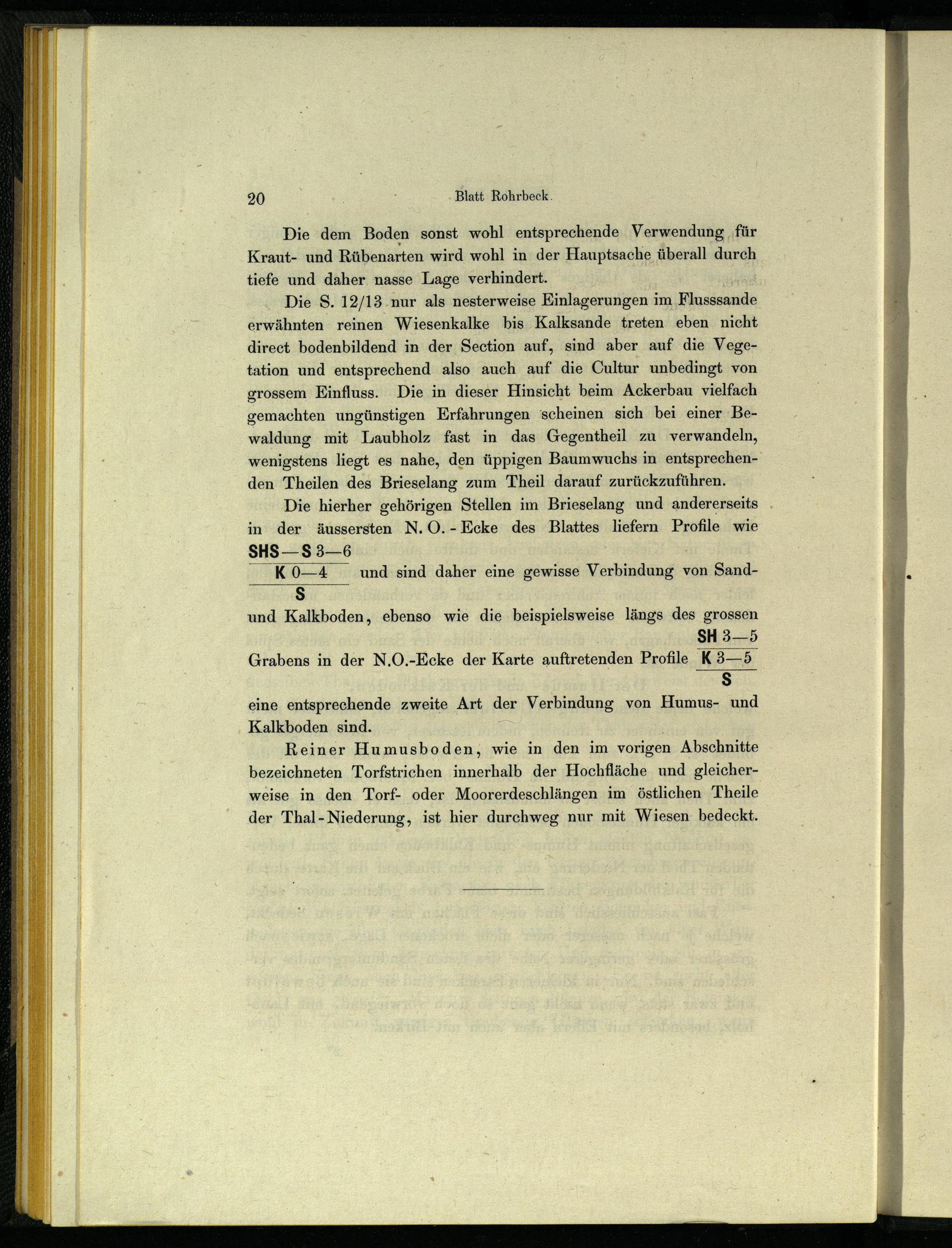 Die S. 12/13 ‚nur als nesterweise Einlagerungen im Flusssande erwähnten reinen Wiesenkalke bis Kalksande treten eben nicht direet bodenbildend in der Section auf, sind aber auf die Vegetation und entsprechend also auch auf die Cultur unbedingt von grossem Einfluss. Die in dieser Hinsicht beim Ackerbau vielfach gemachten ungünstigen Erfahrungen'scheinen sich bei einer Bewaldung mit Laubholz fast in das Gegentheil zu verwandeln, wenigstens liegt es nahe, den üppigen Baumwuchs in entsprechenden Theilen des Brieselang zum Theil darauf zurückzuführen.