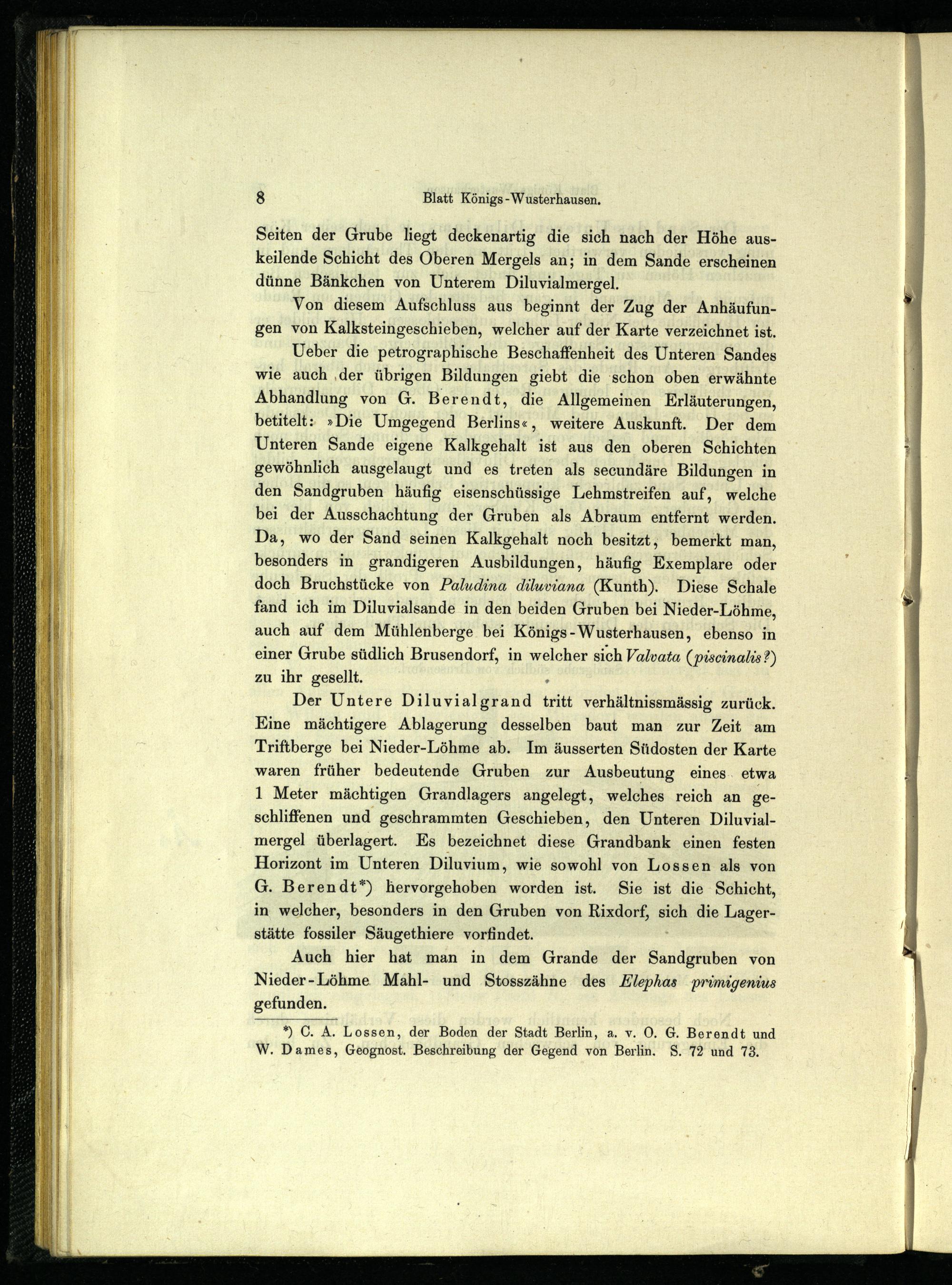 Eine mächtigere Ablagerung desselben baut man zur Zeit am Triftberge bei Nieder-Löhme ab. Im äusserten Südosten der Karte waren früher bedeutende Gruben zur Ausbeutung eines. etwa 1 Meter mächtigen Grandlagers angelegt, welches reich an geschliffenen und geschrammten Geschieben, den Unteren Diluvialmergel überlagert. Es bezeichnet diese Grandbank einen festen Horizont im Unteren Diluvium, wie sowohl von Lossen als von G. Berendt*) hervorgehoben worden ist. Sie ist die Schicht, in welcher, besonders in den Gruben von Rixdorf, sich die Lagerstätte fossiler Säugethiere vorfindet.