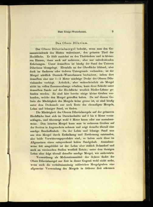 Die Mächtigkeit des Oberen Diluvialmergels auf der grösseren Hochfläche lässt sich im Durschschnitte auf 3 bis 4 Meter veranschlagen, und übersteigt wohl 6 Meter kaum oder nur ausnahmsweise. Den intacten Mergel kann man in mehreren Gruben auf der Section in Augenschein nehmen und zeigt derselbe überall eine sandige Beschaffenheit. Da der Lehm und lehmige Sand nun aus dem Mergel durch Entkalkung und Entthonung entstanden, also beide Verwitterungsprodukte sind, so haben auch diese im Allgemeinen einen entsprechend hohen Sandgehalt.. Ausnahmsweise fett ausgebildet ist der Lehm aber südlich Bohnsdorf und auch an vereinzelten Stellen westlich Rotzis; unter dem thonigen Lehm aber folgt überall derselbe sandige Mergel, wie anderwärts.