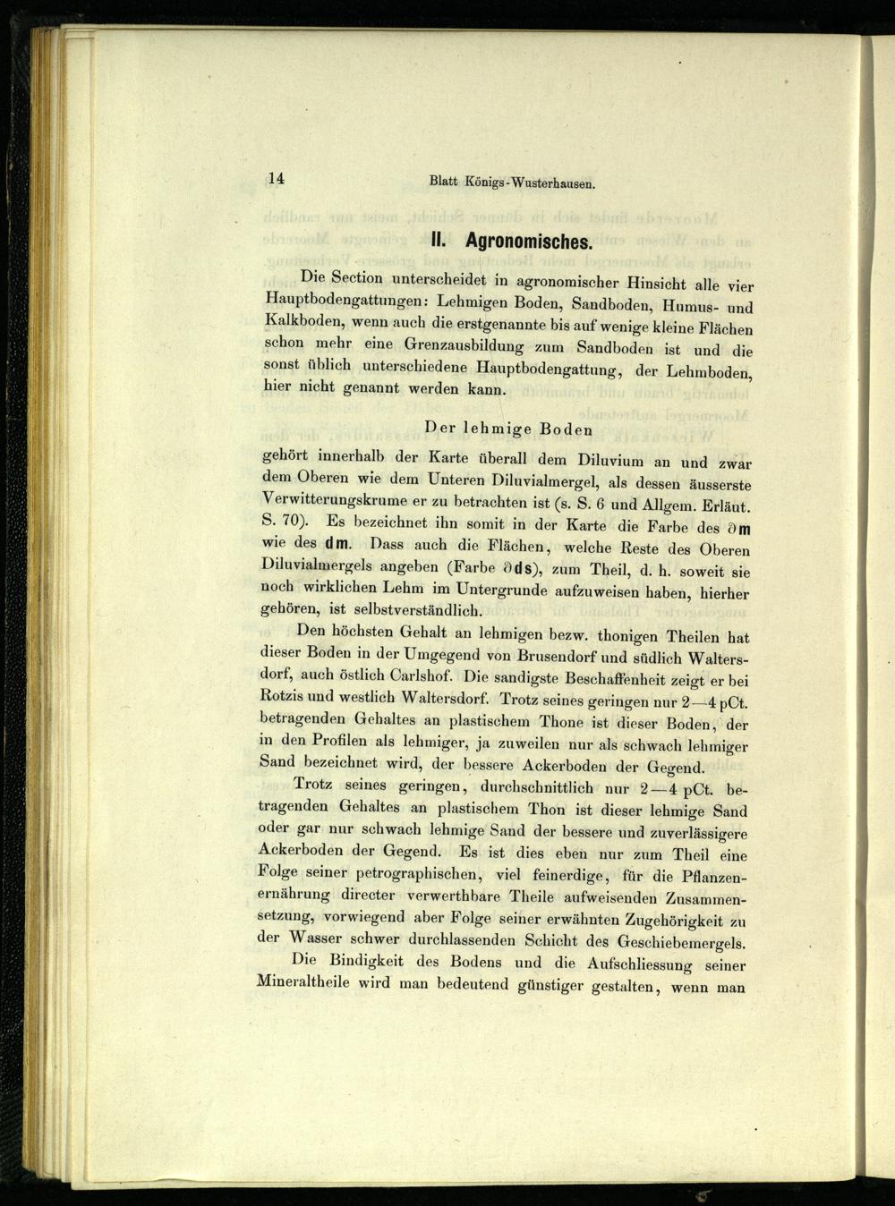 gehört innerhalb der Karte überall dem Diluvium an und zwar dem Oberen wie dem Unteren Diluvialmergel, als dessen äusserste Verwitterungskrume er zu betrachten ist(s. S. 6 und Allgem. Erläut. S. 70). Es bezeichnet ihn somit in der Karte die Farbe des dm wie des dm. Dass auch die Flächen, welche Reste des Oberen Diluvialmergels angeben(Farbe Öds), zum Theil, d. h. soweit sie noch wirklichen Lehm im Untergrunde aufzuweisen haben, hierher gehören, ist selbstverständlich.