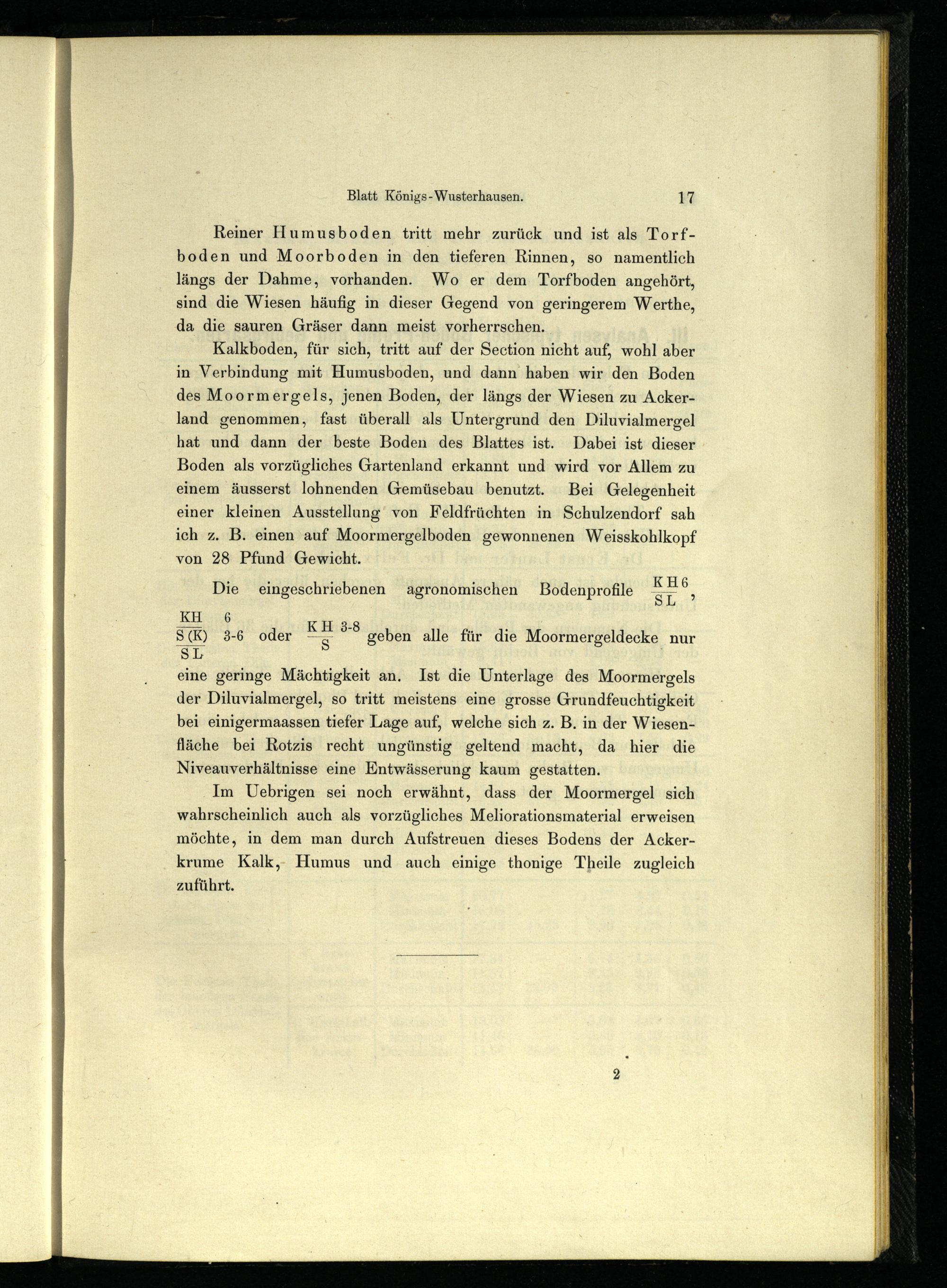 Kalkboden, für sich, tritt auf der Section nicht auf, wohl aber in Verbindung mit Humusboden, und dann haben wir den Boden des Moormergels, jenen Boden, der längs der Wiesen zu Ackerland genommen, fast überall als Untergrund den Diluvialmergel hat und dann der beste Boden des Blattes ist. Dabei ist dieser Boden als vorzügliches Gartenland erkannt und wird vor Allem zu einem äusserst lohnenden Gemüsebau benutzt. Bei Gelegenheit einer kleinen Ausstellung‘ von Feldfrüchten in Schulzendorf sah ich z. B. einen auf Moormergelboden gewonnenen Weisskohlkopf von 28 Pfund Gewicht.