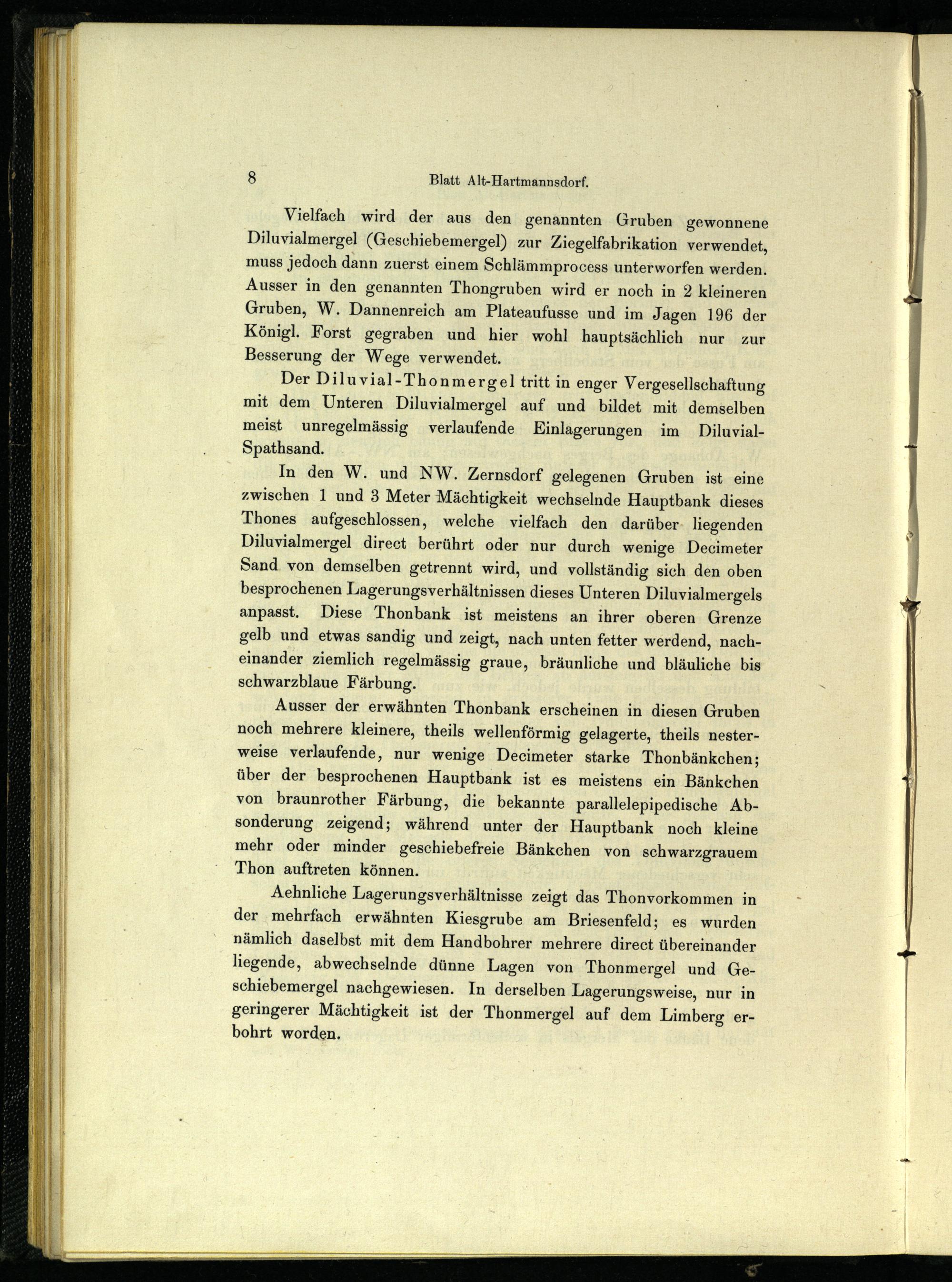 In den W. und NW. Zernsdorf gelegenen Gruben ist eine zwischen 1 und 3 Meter Mächtigkeit wechselnde Hauptbank dieses Thones aufgeschlossen, welche vielfach den darüber liegenden Diluvialmergel direct berührt oder nur durch wenige Decimeter Sand. von demselben getrennt wird, und vollständig sich den oben besprochenen Lagerungsverhältnissen dieses Unteren Diluvialmergels anpasst, Diese Thonbank ist meistens an ihrer oberen Grenze gelb und etwas sandig und zeigt, nach unten fetter werdend, nacheinander ziemlich regelmässig graue, bräunliche und bläuliche bis schwarzblaue Färbung.