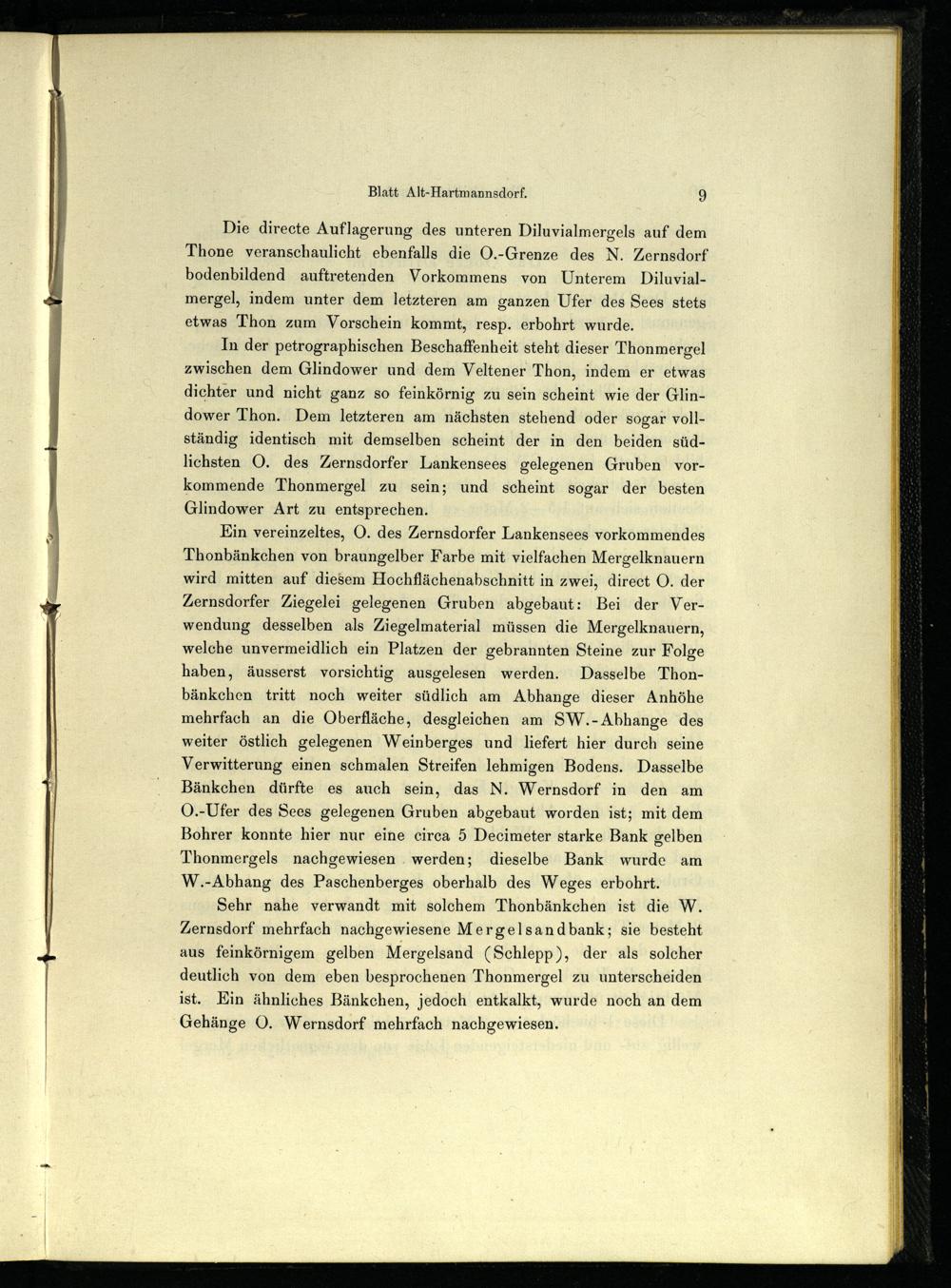 Ein vereinzeltes, O. des Zernsdorfer Lankensees vorkommendes Thonbänkchen von braungelber Farbe mit vielfachen Mergelknauern wird mitten auf diesem Hochflächenabschnitt in zwei, direct O. der Zernsdorfer Ziegelei gelegenen Gruben abgebaut: Bei der Verwendung desselben als Ziegelmaterial müssen die Mergelknauern, welche unvermeidlich ein Platzen der gebrannten Steine zur Folge haben, äusserst vorsichtig ausgelesen werden. Dasselbe Thonbänkchen tritt noch weiter südlich am Abhange dieser Anhöhe mehrfach an die Oberfläche, desgleichen am SW.-Ahhange des weiter östlich gelegenen Weinberges und liefert hier durch seine Verwitterung einen schmalen Streifen lehmigen Bodens. Dasselbe Bänkchen dürfte es auch sein, das N. Wernsdorf in den am O.-Ufer des Sees gelegenen Gruben abgebaut worden ist; mit dem Bohrer konnte hier nur eine circa 5 Decimeter starke Bank gelben Thonmergels nachgewiesen, werden; dieselbe Bank wurde am W.-Abhang des Paschenberges oberhalb des Weges erbohrt.