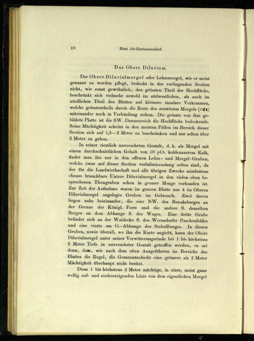 In seiner ziemlich unversehrten Gestalt, d. h. als Mergel mit einem durchschnittlichen Gehalt von 10 pCt.”kohlensaurem Kalk, findet man ihn nur in den offenen Lehm- und Mergel- Gruben, welche zwar auf dieser Section verhältnissmässig selten sind, da der für die Landwirthschaft und alle übrigen Zwecke mindestens ebenso brauchbare Untere Diluvialmergel in den vielen oben besprochenen Thongruben schon in grosser Menge vorhanden ist. Zur Zeit der Aufnahme waren im ganzen Blatte nur 4 im Oberen Diluvialmergel angelegte Gruben im Gebrauch. Zwei davon liegen nahe beieinander, die eine NW. des Bunaksberges an der Grenze der Königl. Forst und die andere S. desselben Berges an dem Abhange S. des Weges. Eine dritte Grube befindet sich an der Waldecke S. des Wernsdorfer Paschenfeldes und eine vierte am O.-Abhange des Stäbellberges. In diesen Gruben, sowie überall, wo ihn die Karte angiebt, kann der Obere Diluvialmergel unter seiner Verwitterungsrinde bei 1 bis höchstens 2 Meter Tiefe in unversehrter Gestalt getroffen werden, es sei denn, dass, wie nach dem oben Ausgeführten im Bereiche des ‚ Blattes die Regel, die Gesammtschicht eine grössere als 2 Meter Mächtigkeit überhaupt nicht besitzt.