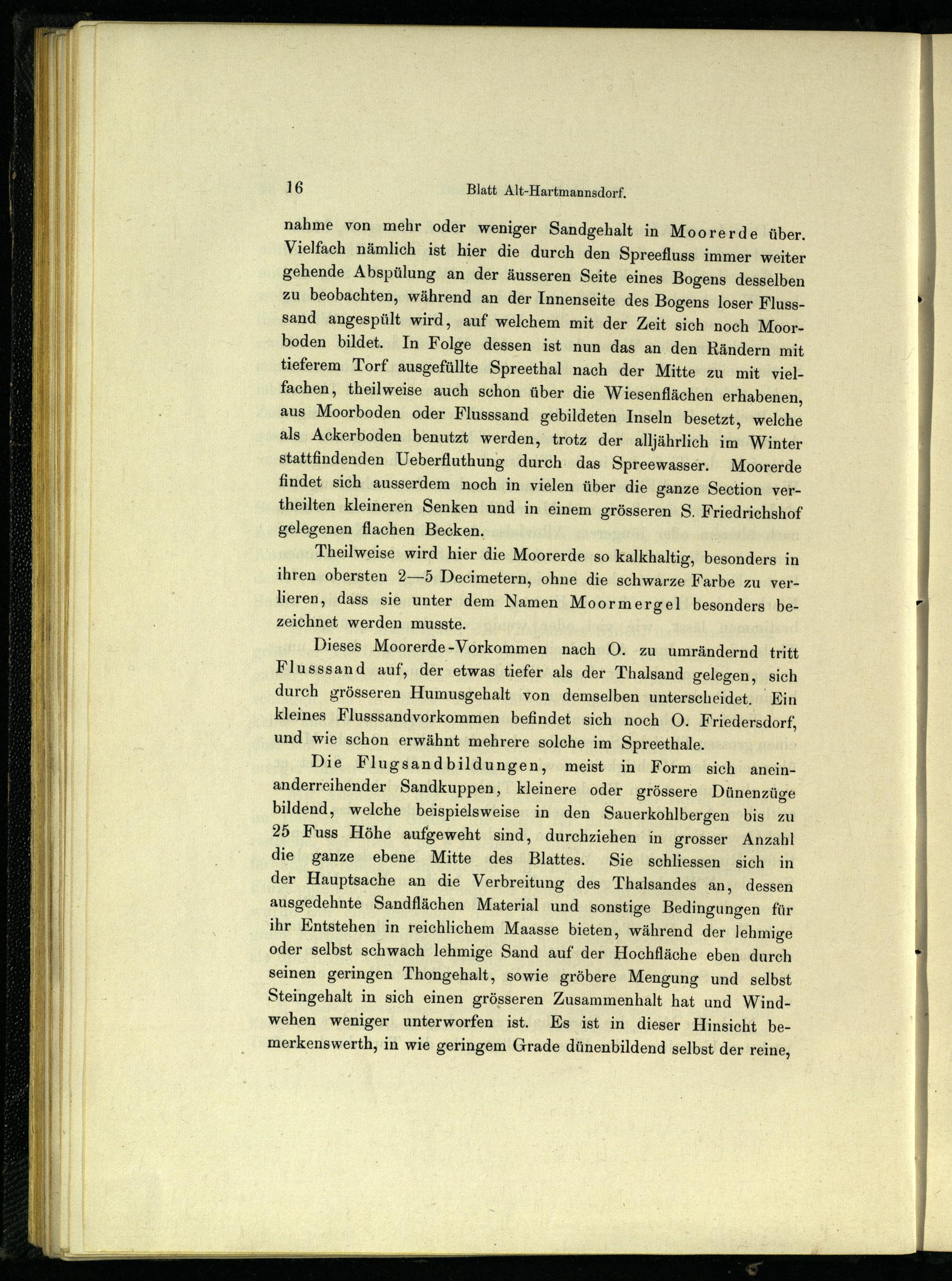 nahme von mehr oder weniger Sandgehalt in Moorerde über. Vielfach nämlich ist hier die durch den Spreefluss immer weiter gehende Abspülung an der äusseren Seite eines Bogens desselben zu beobachten, während an der Innenseite des Bogens loser Flusssand angespült wird, auf welchem mit der Zeit sich noch Moorboden bildet. In Folge dessen ist nun das an den Rändern mit tieferem Torf ausgefüllte Spreethal nach der Mitte zu mit vielfachen, theilweise auch schon über die Wiesenflächen erhabenen, aus Moorboden oder Flusssand gebildeten Inseln besetzt, welche als Ackerboden benutzt werden, trotz der alljährlich im Winter stattfindenden Ueberfluthung durch: das Spreewasser. Moorerde findet sich ausserdem noch in vielen über die ganze Section vertheilten kleineren Senken und in einem grösseren S. Friedrichshof gelegenen flachen Becken.