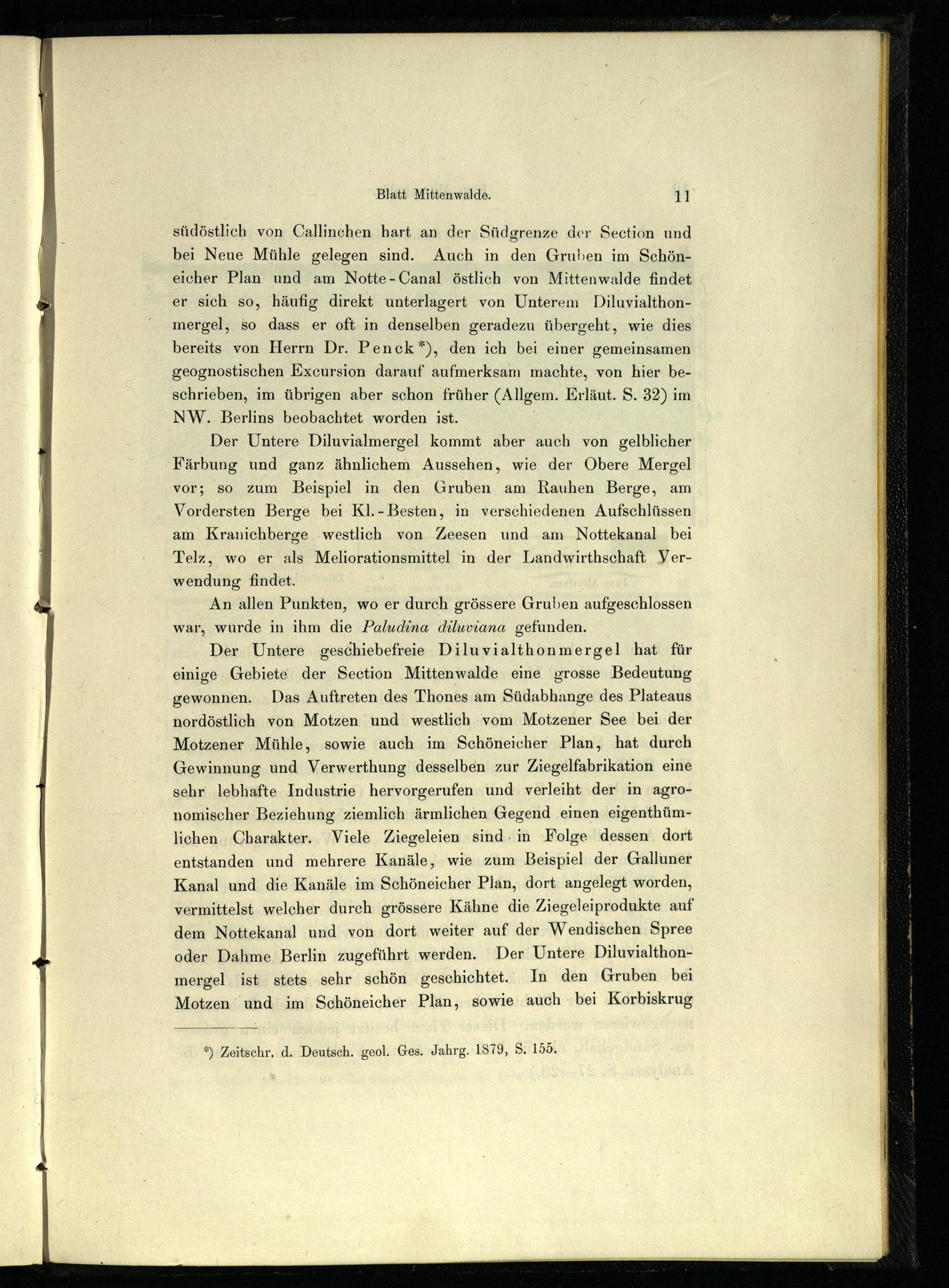 südöstlich von Callinchen hart an der Südgrenze der Section und bei Neue Mühle gelegen sind. Auch in den Gruben im Schöneicher Plan und am Notte- Canal östlich von Mittenwalde findet ; er sich so, häufig direkt unterlagert von Unterem Diluvialthon