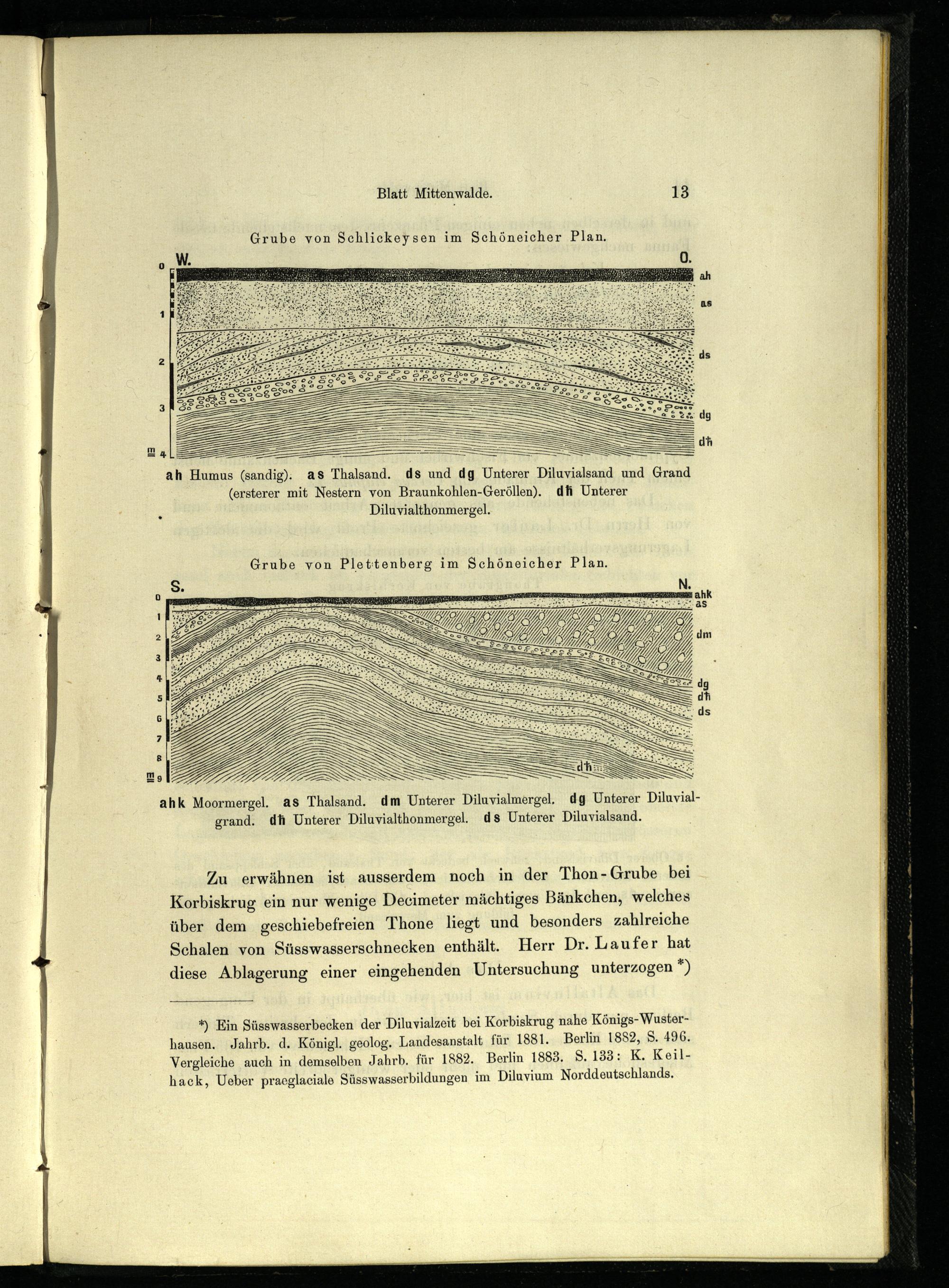 *) Ein Süsswasserbecken der Diluvialzeit bei Korbiskrug nahe Königs-Wuster hausen . Jahrb. d. Königl. geolog. Landesanstalt für 1881. Berlin 1882, S. 496. Vergleiche auch in demselben Jahrb. für 1882. Berlin 1883. S. 133: K. Keilhack, Ueber pracglaciale Süsswasserbildungen im Diluvium Norddeutschlands.