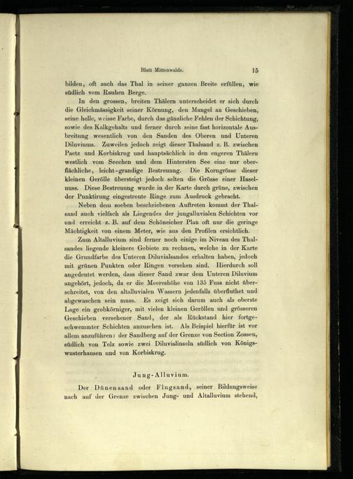 Zum Altalluvium sind ferner noch einige im Niveau des Thalsandes liegende kleinere Gebiete zu rechnen, welche in der Karte die Grundfarbe des Unteren Diluvialsandes erhalten haben, jedoch mit grünen Punkten oder Ringen versehen sind. Hierdurch soll angedeutet werden, dass dieser Sand zwar dem Unteren Diluvium angehört, jedoch, da er die Meereshöhe von 135 Fuss nicht überschreitet, von den altalluvialen Wassern jedenfalls überfluthet und