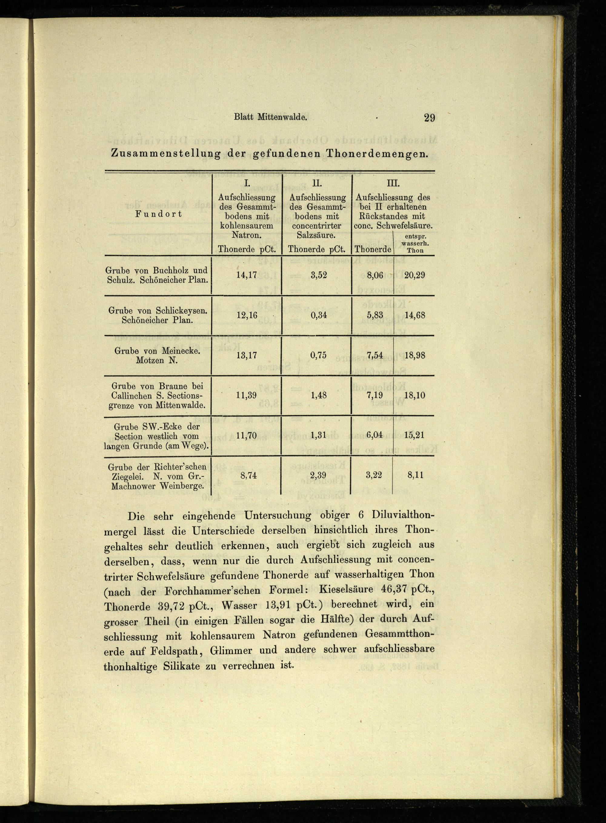 Die sehr eingehende Untersuchung obiger 6 Diluvialthonmergel lässt die Unterschiede derselben hinsichtlich ihres Thon-. gehaltes sehr deutlich erkennen, auch ergiebt sich zugleich aus derselben, dass, wenn nur die durch Aufschliessung mit concentrirter Schwefelsäure gefundene Thonerde auf wasserhaltigen Thon (nach der Forchhammer’schen Formel: Kieselsäure 46,37 pCt., Thonerde 39,72 pCt., Wasser 13,91 pCt.) berechnet wird, ein grosser Theil(in einigen Fällen sogar die Hälfte) der durch Aufschliessung mit kohlensaurem Natron gefundenen Gesammtthonerde auf Feldspath , Glimmer und andere schwer aufschliessbare thonhaltige Silikate zu verrechnen ist.