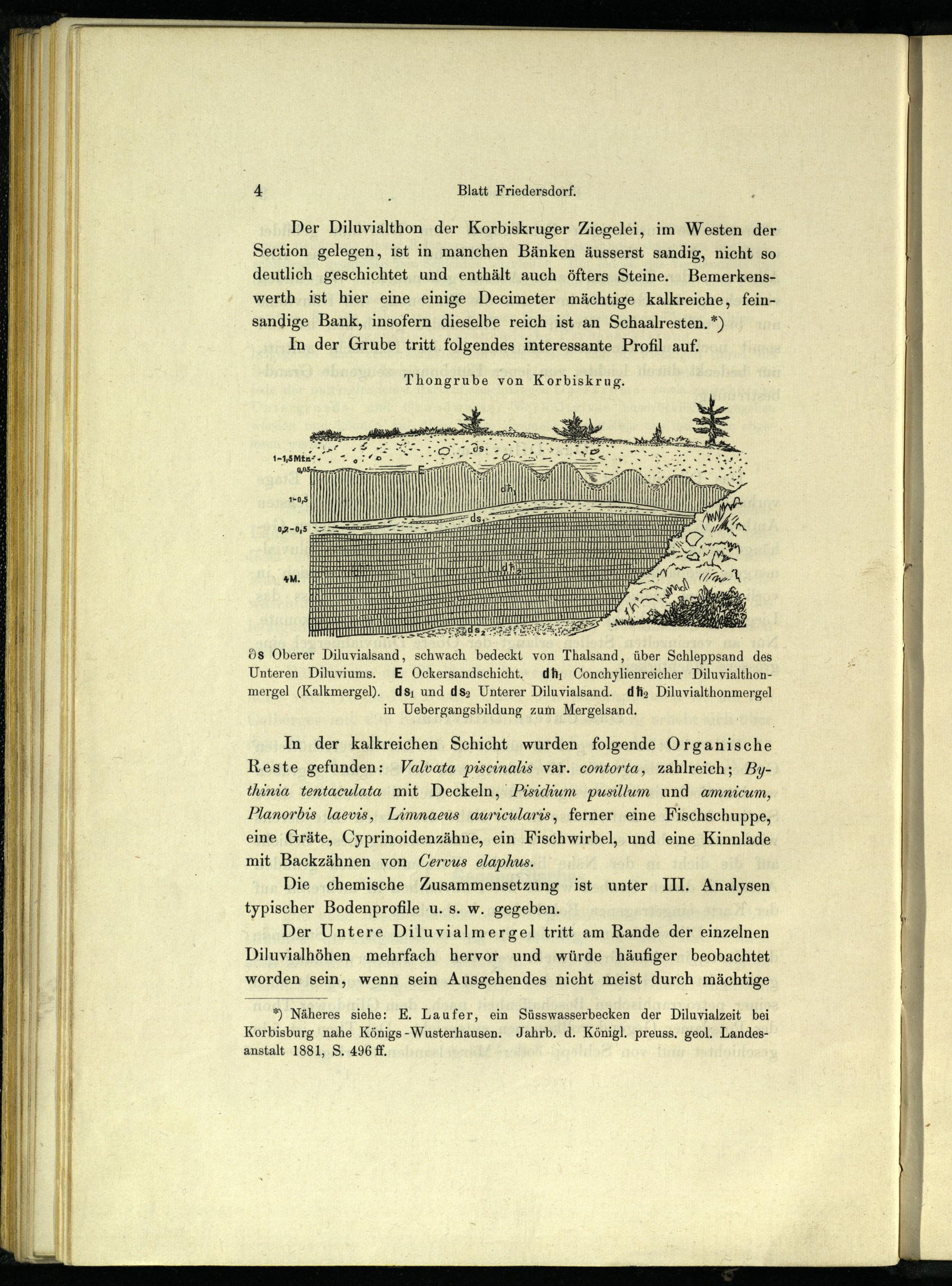 Der Diluvialthon der Korbiskruger Ziegelei, im Westen der Section gelegen, ist in manchen Bänken äusserst sandig, nicht so deutlich geschichtet und enthält auch öfters Steine. Bemerkenswerth ist hier eine einige Decimeter mächtige kalkreiche, feinsandige Bank, insofern dieselbe reich ist an Schaalresten.*)