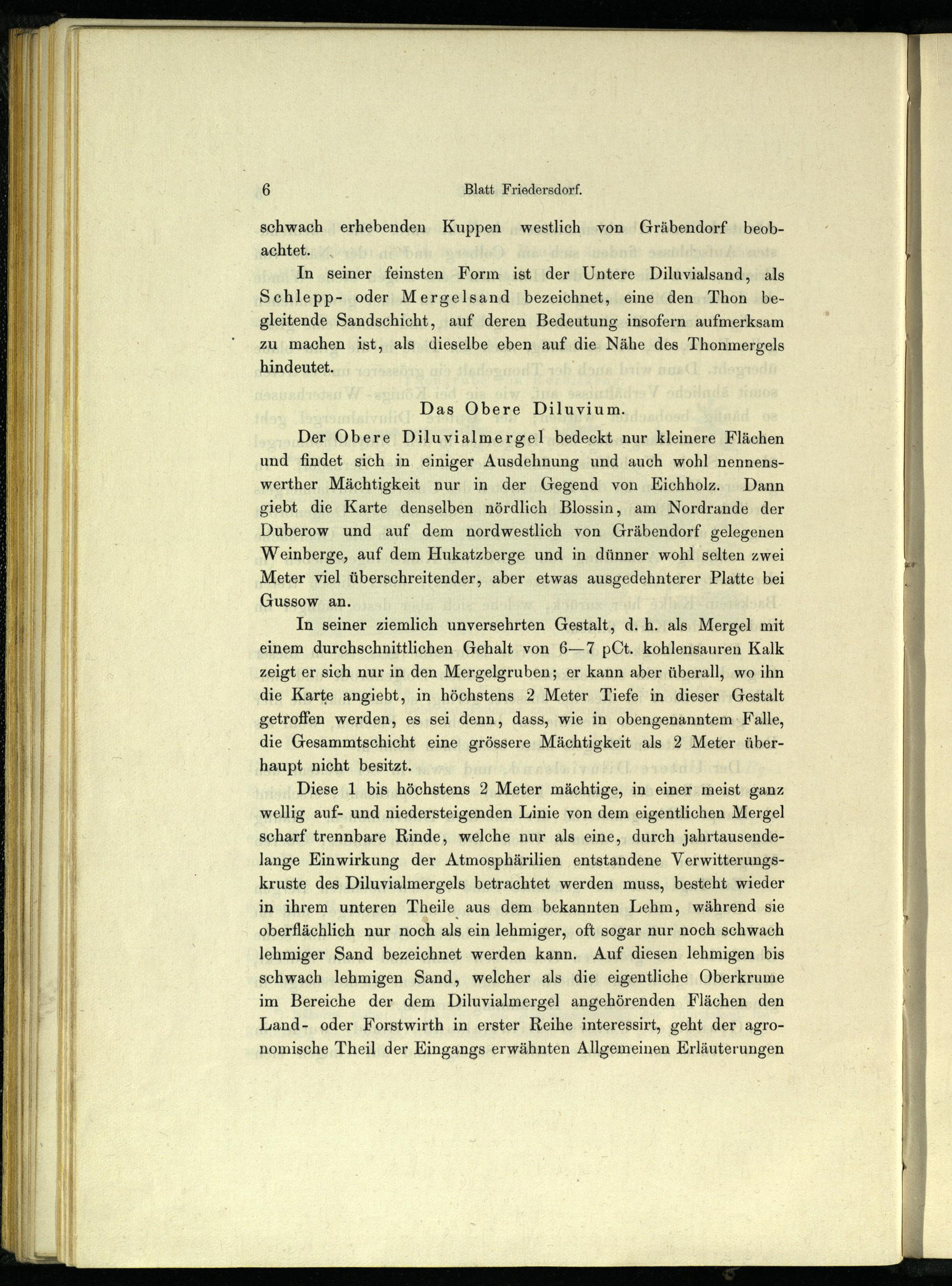 Der Obere Diluvialmergel bedeckt nur kleinere Flächen und findet sich in einiger Ausdehnung und auch wohl nennenswerther Mächtigkeit nur in der Gegend von KEichholz. Dann giebt die Karte denselben nördlich Blossin , am Nordrande der Duberow und auf dem nordwestlich von Gräbendorf gelegenen Weinberge, auf dem Hukatzberge und in dünner wohl selten zwei Meter viel überschreitender, aber etwas ausgedehnterer Platte bei Gussow an.