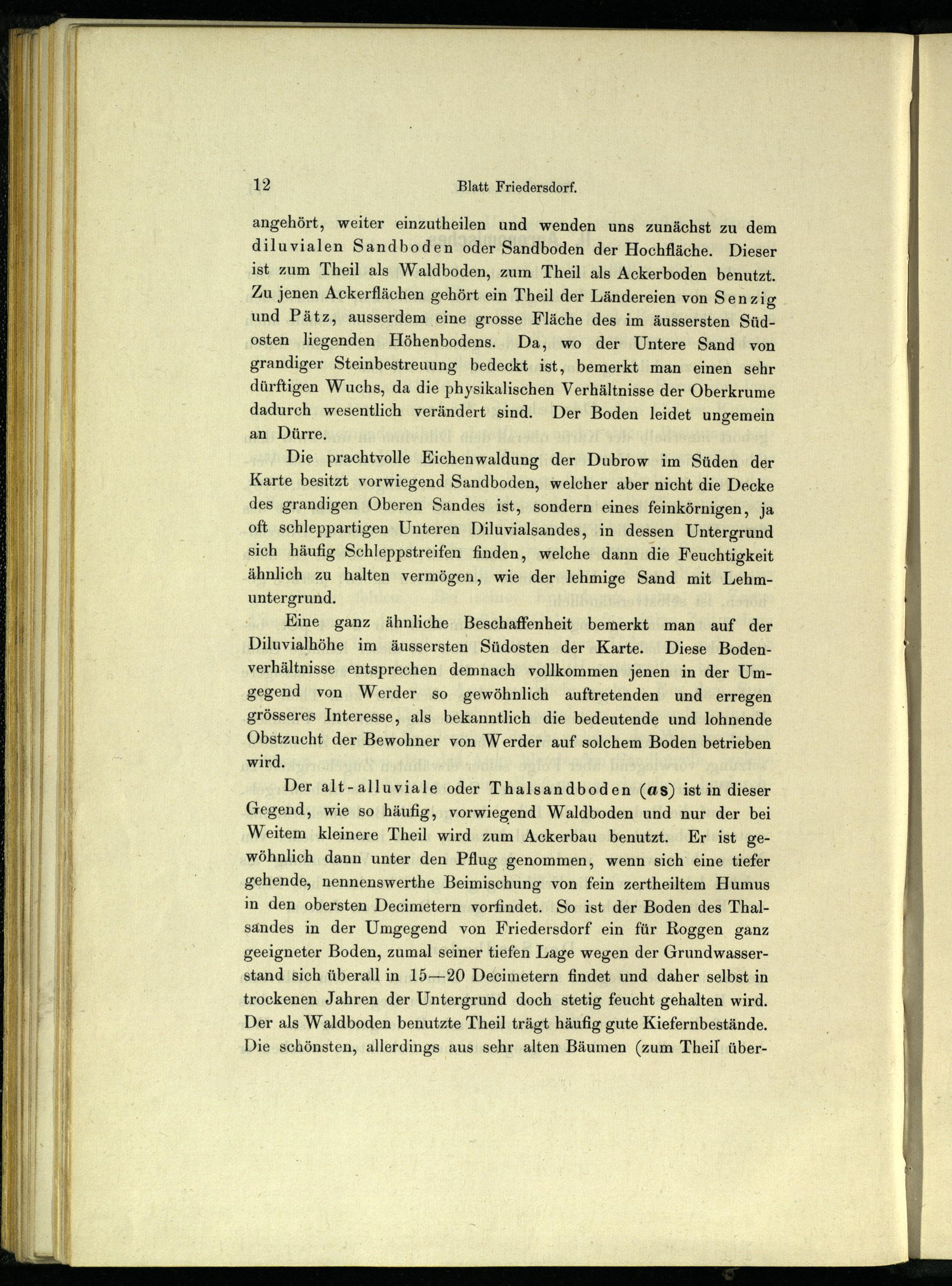Der alt-alluviale oder Thalsandboden(as) ist in dieser Gegend, wie so häufig, vorwiegend Waldboden und nur der bei Weitem kleinere Theil wird zum Ackerbau benutzt. Er ist gewöhnlich dann unter den Pflug genommen, wenn sich eine tiefer gehende, nennenswerthe Beimischung von fein zertheiltem Humus in den obersten Decimetern vorfindet. So ist der Boden des Thalsandes in der Umgegend von Friedersdorf ein für Roggen ganz geeigneter Boden, zumal seiner tiefen Lage wegen der Grundwasserstand sich überall in 15—20 Deecimetern findet und daher selbst in trockenen Jahren der Untergrund doch stetig feucht gehalten wird. Der als Waldboden benutzte Theil trägt häufig gute Kiefernbestände. Die schönsten, allerdings aus sehr alten Bäumen(zum Theil über