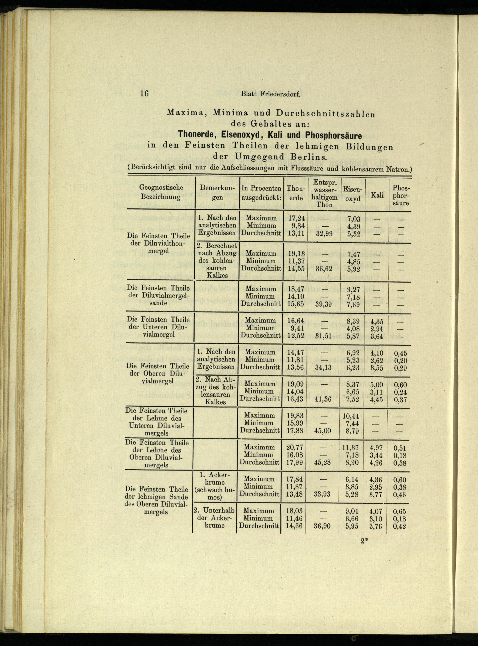 Maxima, Minima und Durchschnittszahlen des Gehaltes an: Thonerde, Eisenoxyd, Kali und Phosphorsäure in den Feinsten Theilen der lehmigen Bildungen der Umgegend Berlins .