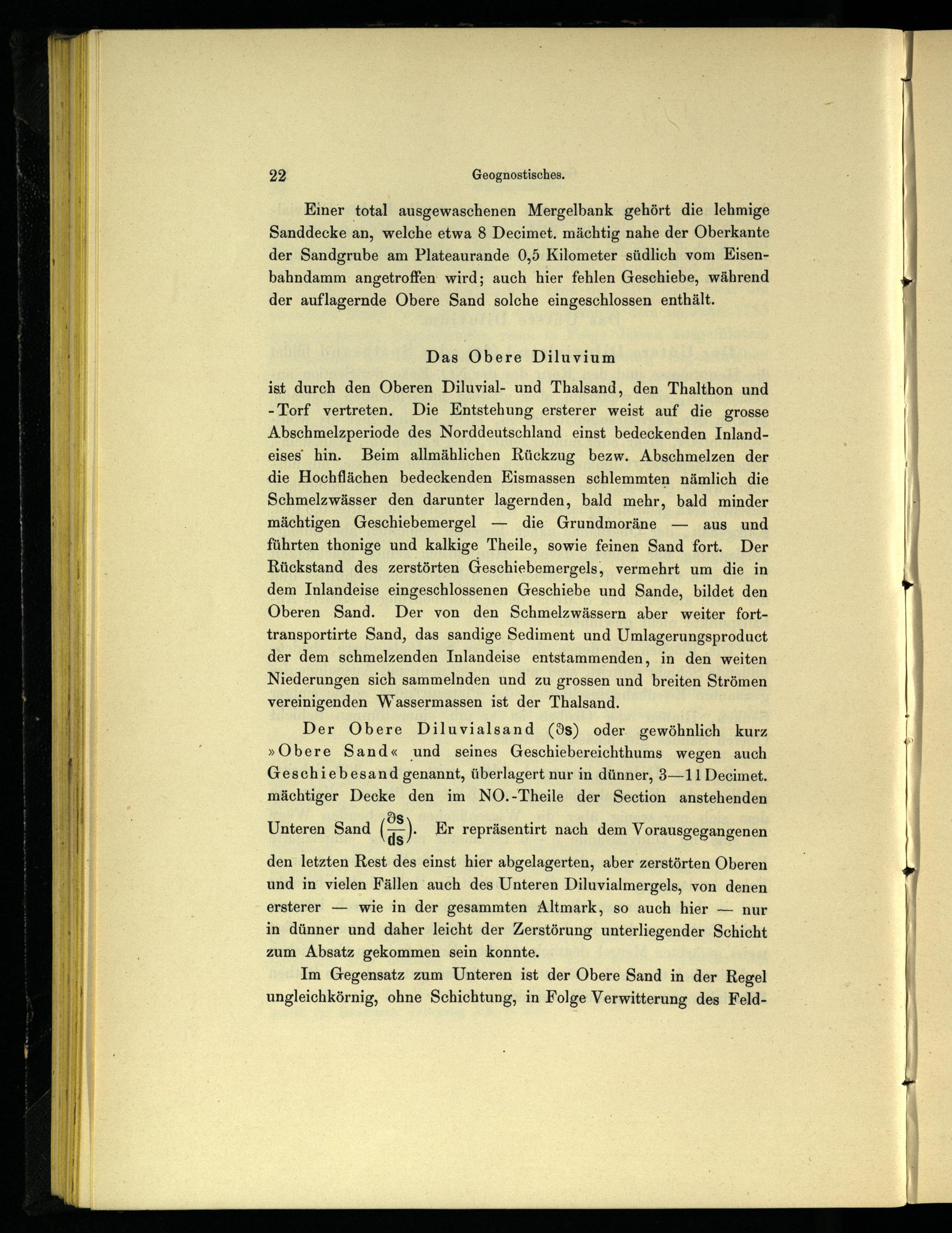 ist durch den Oberen Diluvial- und Thalsand, den Thalthon und -Torf vertreten. Die Entstehung ersterer weist auf die grosse Abschmelzperiode des Norddeutschland einst bedeckenden Inlandeises‘ hin. Beim allmählichen Rückzug bezw. Abschmelzen der die Hochflächen bedeckenden Eismassen schlemmten nämlich die Schmelzwässer den darunter lagernden, bald mehr, bald minder mächtigen Geschiebemergel— die Grundmoräne— aus und führten thonige und kalkige Theile, sowie feinen Sand fort. Der Rückstand des zerstörten Geschiebemergels, vermehrt um die in dem Inlandeise eingeschlossenen Geschiebe und Sande, bildet den Oberen Sand. Der von den Schmelzwässern aber weiter forttransportirte Sand, das sandige Sediment und Umlagerungsproduct der dem schmelzenden Inlandeise entstammenden, in den weiten Niederungen sich sammelnden und zu grossen und breiten Strömen vereinigenden Wassermassen ist der Thalsand.