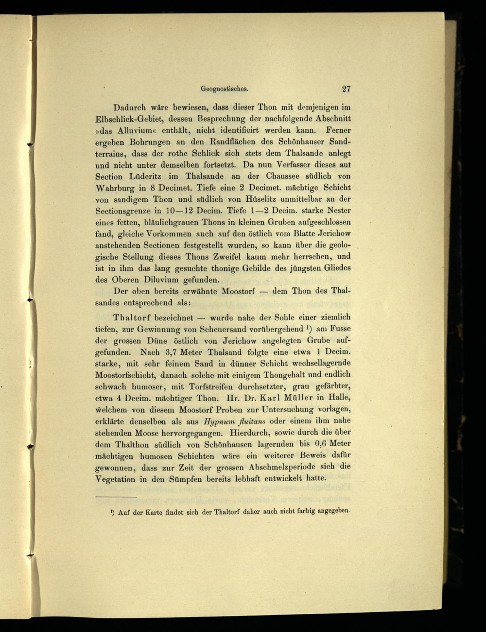 Thaltorf bezeichnet— wurde nahe der Sohle einer ziemlich tiefen, zur Gewinnung von Scheuersand vorübergehend!) am Fusse der grossen Düne östlich von Jerichow angelegten Grube aufgefunden. Nach 3,7 Meter Thalsand folgte eine etwa 1 Decim. starke, mit sehr feinem Sand in dünner Schicht. wechsellagernde Moostorfschicht, danach solche mit einigem Thongehalt und endlich schwach humoser, mit Torfstreifen durchsetzter, grau gefärbter, etwa 4 Decim. mächtiger Thon. Hr. Dr. Karl Müller in Halle, welchem von diesem Moostorf Proben zur Untersuchung vorlagen, erklärte denselben als aus Hypnum flwitans oder einem ihm nahe stehenden Moose hervorgegangen. Hierdurch, sowie durch die über dem Thalthon südlich von Schönhausen lagernden bis 0,6 Meter mächtigen humosen Schichten wäre ein weiterer Beweis dafür gewonnen, dass zur Zeit der grossen Abschmelzperiode sich die Vegetation in den Sümpfen bereits lebhaft entwickelt hatte.