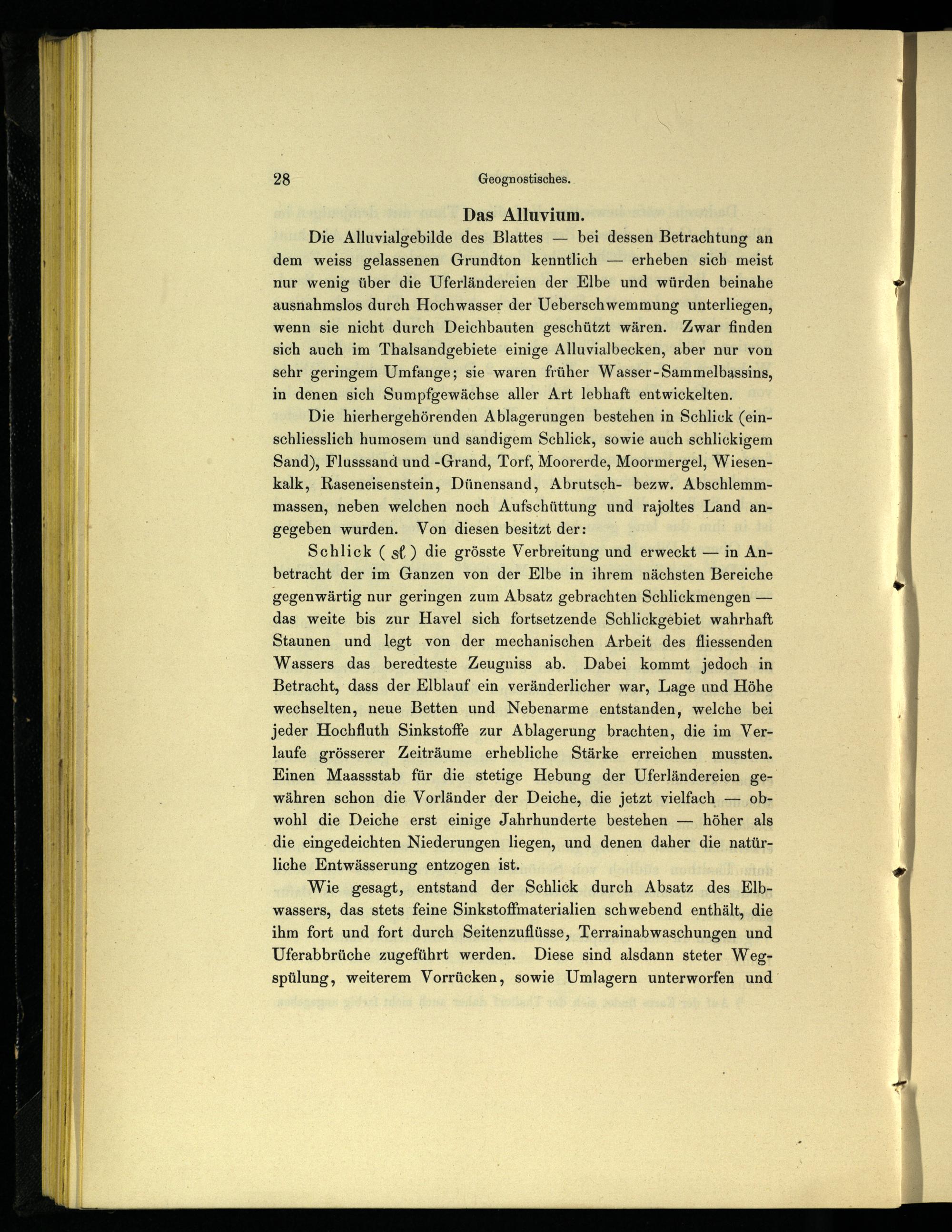 Schlick( st) die grösste Verbreitung und erweckt— in Anbetracht der im Ganzen von der Elbe in ihrem nächsten Bereiche gegenwärtig nur geringen zum Absatz gebrachten Schlickmengen— das weite bis zur Havel sich fortsetzende Schlickgebiet wahrhaft Staunen und legt von der mechanischen Arbeit des fliessenden Wassers das beredteste Zeugniss ab. Dabei kommt jedoch in Betracht, dass der Elblauf ein veränderlicher war, Lage und Höhe wechselten, neue Betten und Nebenarme entstanden, welche bei jeder Hochfluth Sinkstoffe zur Ablagerung brachten, die im Verlaufe grösserer Zeiträume erhebliche Stärke erreichen mussten. Einen Maassstab für die stetige Hebung der Uferländereien gewähren schon die Vorländer der Deiche, die jetzt vielfach— obwohl die Deiche erst einige Jahrhunderte bestehen— höher als die eingedeichten Niederungen liegen, und denen daher die natürliche Entwässerung entzogen ist.;