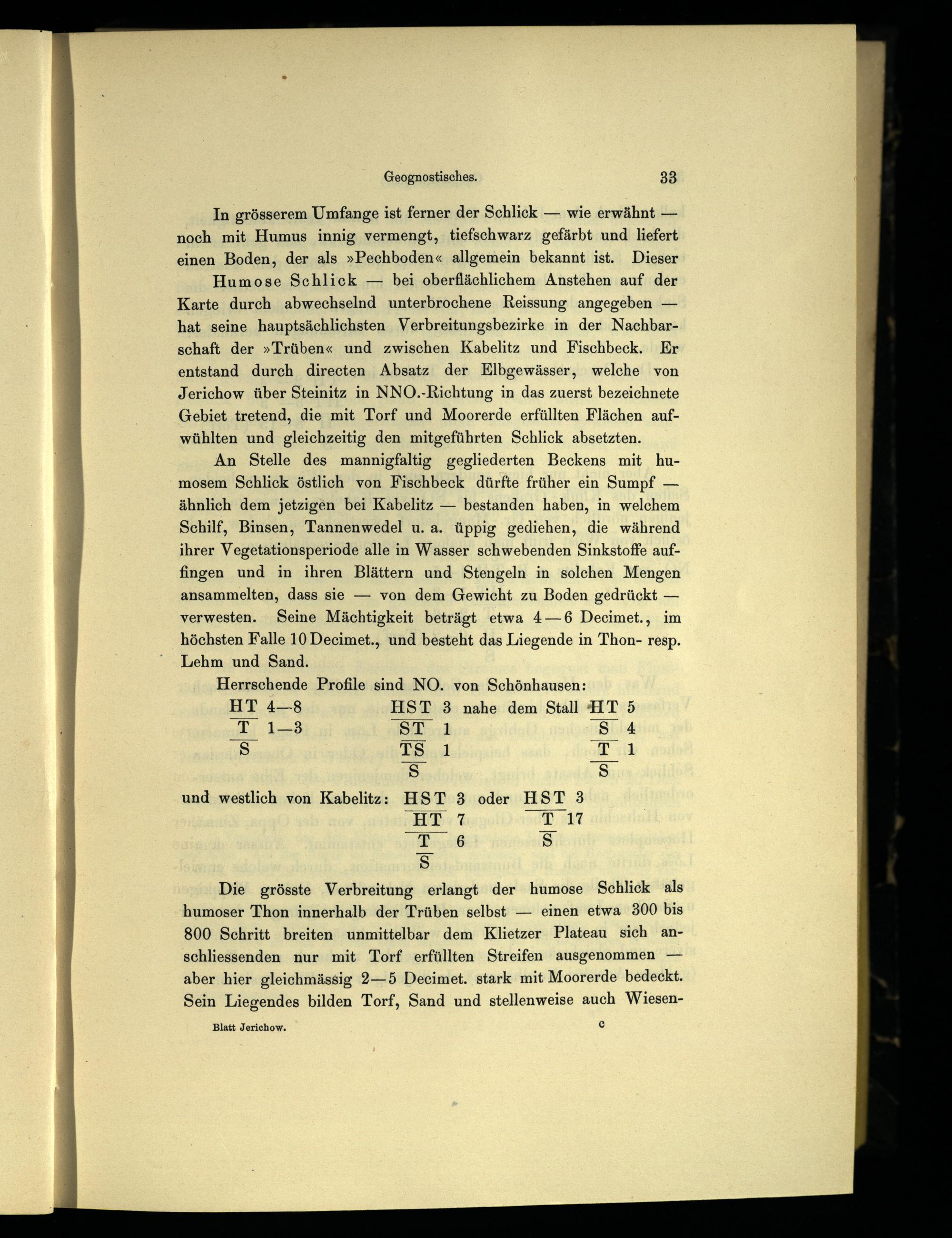 Die grösste Verbreitung erlangt der humose Schlick als humoser Thon innerhalb der Trüben selbst— einen etwa 300 bis 800 Schritt breiten unmittelbar dem Klietzer Plateau sich anschliessenden nur mit Torf erfüllten Streifen ausgenommen— aber hier gleichmässig 2—5 Deecimet. stark mit Moorerde bedeckt. Sein Liegendes bilden Torf, Sand und stellenweise auch Wiesen