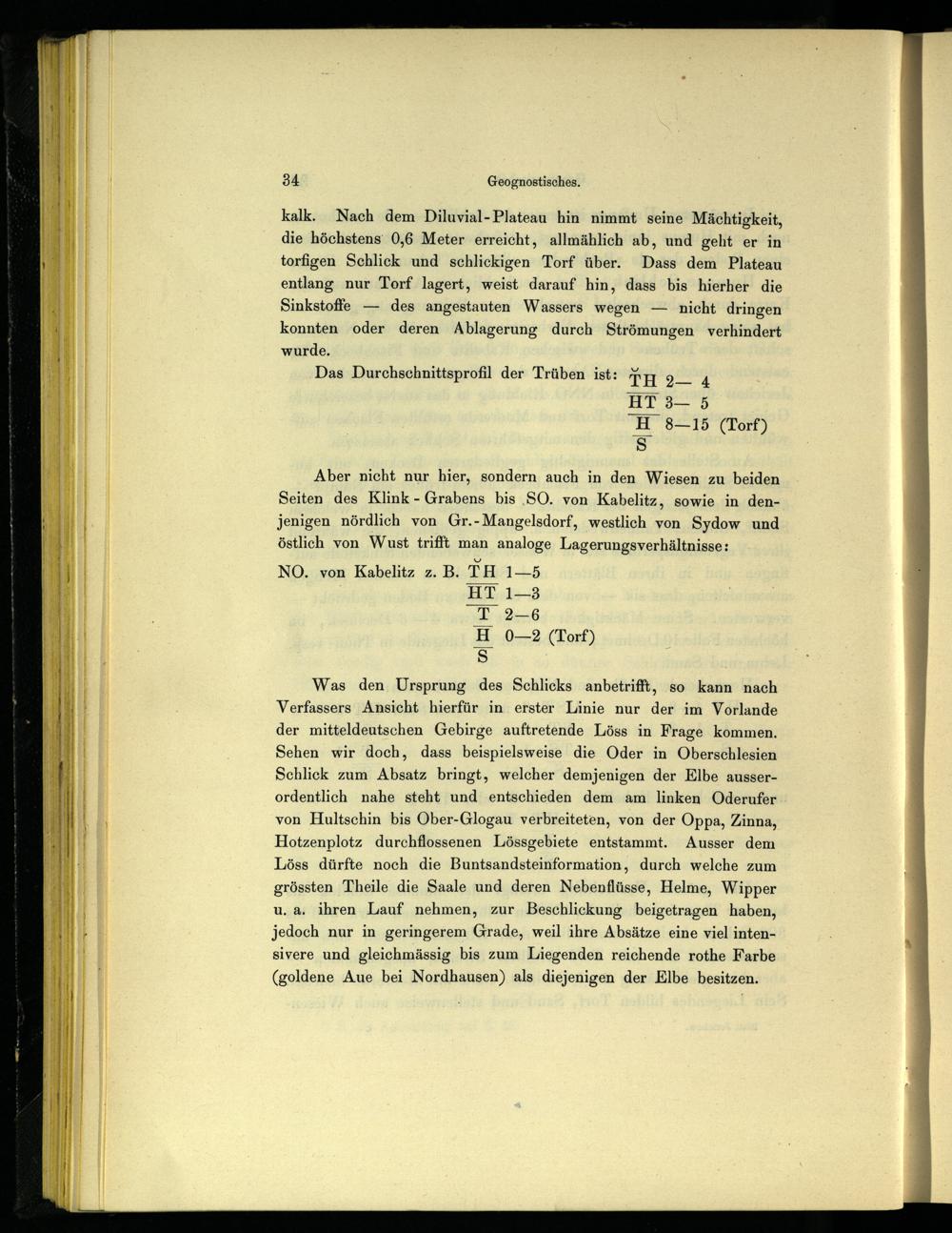 kalk. Nach dem Diluvial- Plateau hin nimmt seine Mächtigkeit, die höchstens‘ 0,6 Meter erreicht, allmählich ab, und geht er in torfigen Schlick und schlickigen Torf über. Dass dem Plateau entlang nur Torf lagert, weist darauf hin, dass bis hierher die Sinkstoffe— des angestauten Wassers wegen— nicht dringen konnten oder deren Ablagerung durch Strömungen verhindert wurde. Das Durchschnittsprofil der Trüben ist: TH