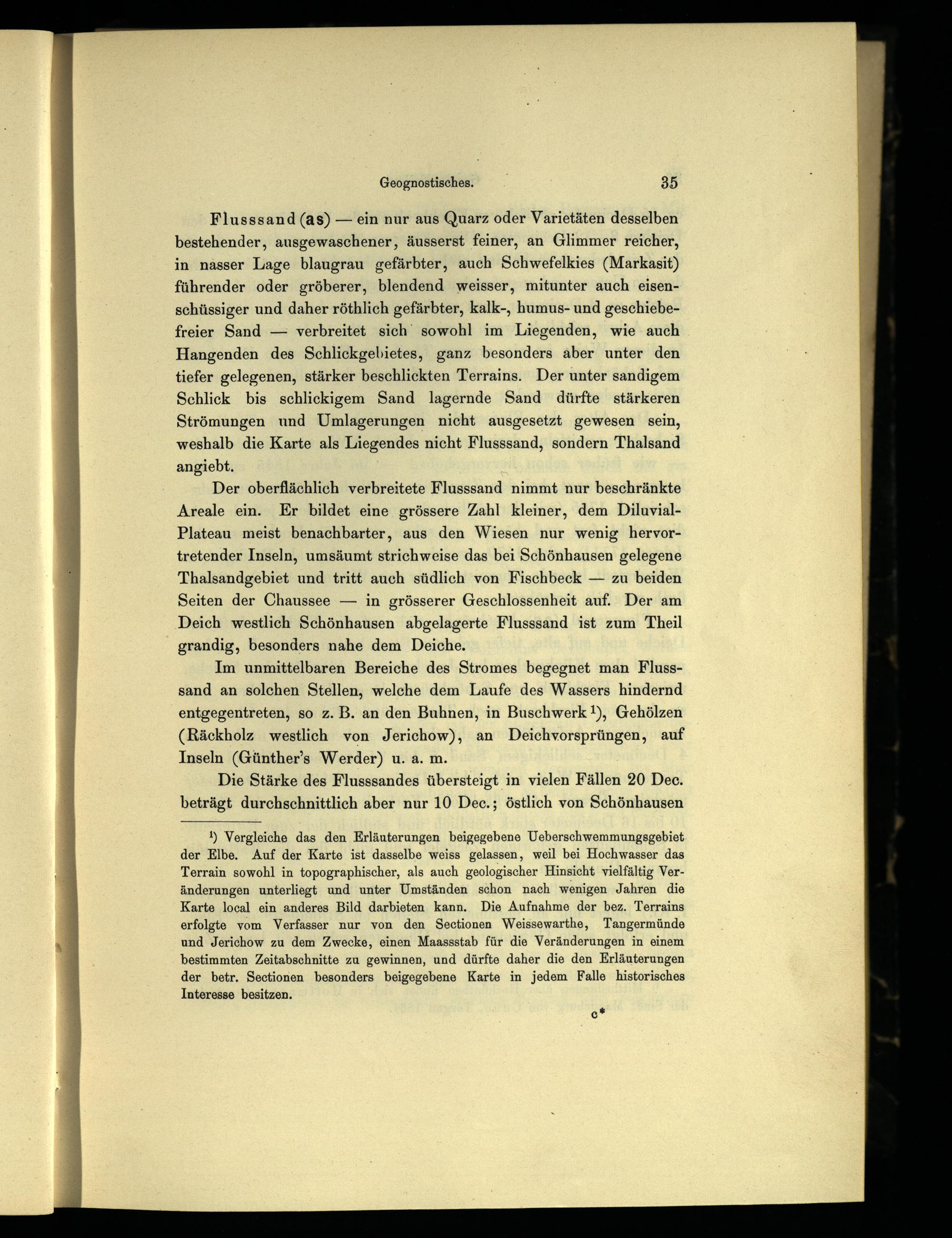 1) Vergleiche das den Erläuterungen beigegebene Ueberschwemmungsgebiet der Elbe. Auf der Karte ist dasselbe weiss gelassen, weil bei Hochwasser das Terrain sowohl in topographischer, als auch geologischer Hinsicht vielfältig Veränderungen unterliegt und unter Umständen schon nach wenigen Jahren die Karte local ein anderes Bild darbieten kann. Die Aufnahme der bez. Terrains erfolgte vom Verfasser nur von den Sectionen Weissewarthe, Tangermünde und Jerichow zu dem Zwecke, einen Maassstab für die Veränderungen in einem bestimmten Zeitabschnitte zu gewinnen, und dürfte daher die den Erläuterungen der betr. Sectionen besonders beigegebene Karte in jedem Falle historisches Interesse besitzen.