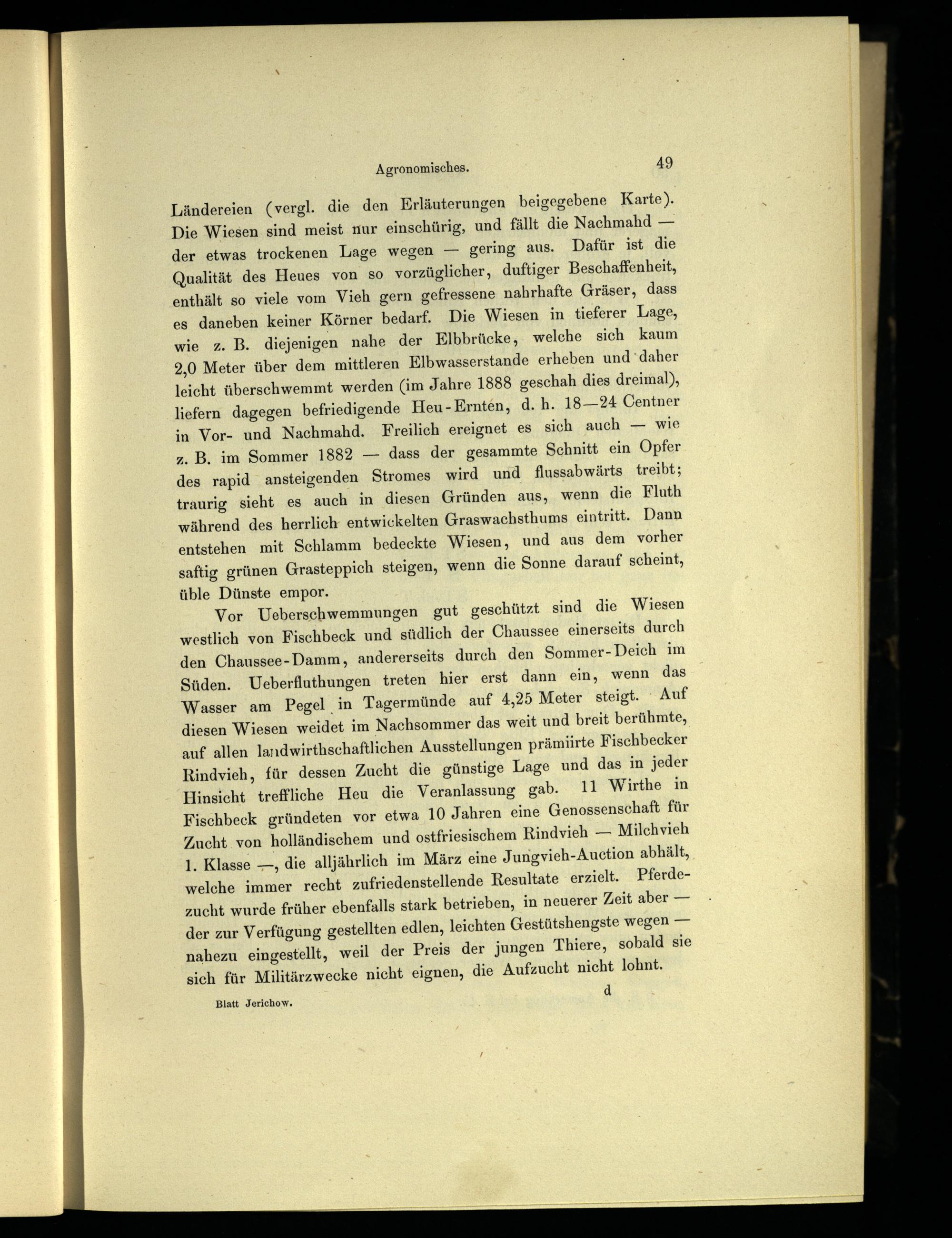 Vor Ueberschwemmungen gut geschützt sind die Wiesen westlich von Fischbeck und südlich der Chaussee einerseits durch den Chaussee-Damm, andererseits durch den Sommer- Deich im Süden. Ueberfluthungen treten hier erst dann ein, wenn das Wasser am Pegel in Tagermünde auf 4,25 Meter steigt. Auf diesen Wiesen weidet im Nachsommer das weit und breit berühmte, auf allen Jandwirthschaftlichen Ausstellungen prämüirte Fischbecker Rindvieh, für dessen Zucht die günstige Lage und das in jeder Hinsicht treffliche Heu die Veranlassung gab. 11 Wirthe in Fischbeck gründeten vor etwa 10 Jahren eine Genossenschaft für Zucht von holländischem und ostfriesischem Rindvieh— Milchvieh 1. Klasse—, die alljährlich im März eine Jungvieh-Auction abhält, welche immer recht zufriedenstellende Resultate erzielt. Pferdezucht wurde früher ebenfalls stark betrieben, in neuerer Zeit aber— der zur Verfügung gestellten edlen, leichten Gestütshengste wegen— nahezu eingestellt, weil der Preis der jungen Thiere, sobald sie sich für Militärzwecke nicht eignen, die Aufzucht nicht lohnt.
